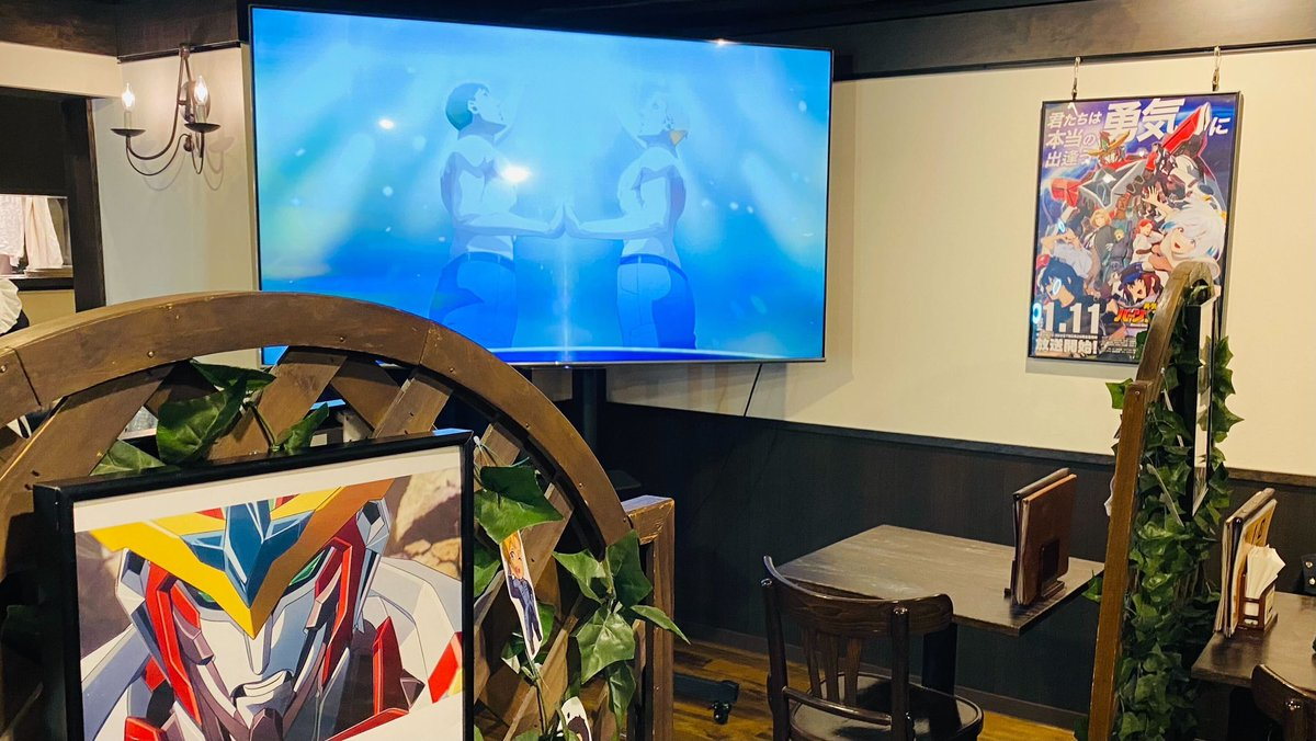 可以到店內的大螢幕播放著 ED 片尾曲「双炎の肖像」,勇蒼與史密斯裸著上半身手貼手一起唱歌,官方真的很會挑圖。