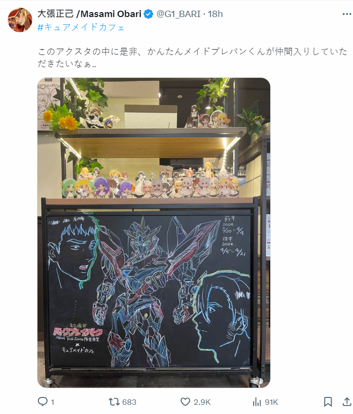大張正已監督還發文表示,希望在店內的女僕壓克力牌中,加入女僕布雷邦在其中,這趣味真的很...懂 ( ? )