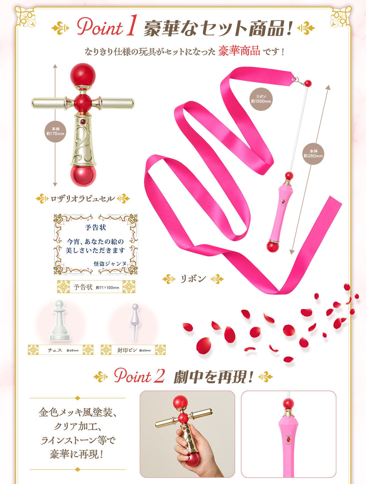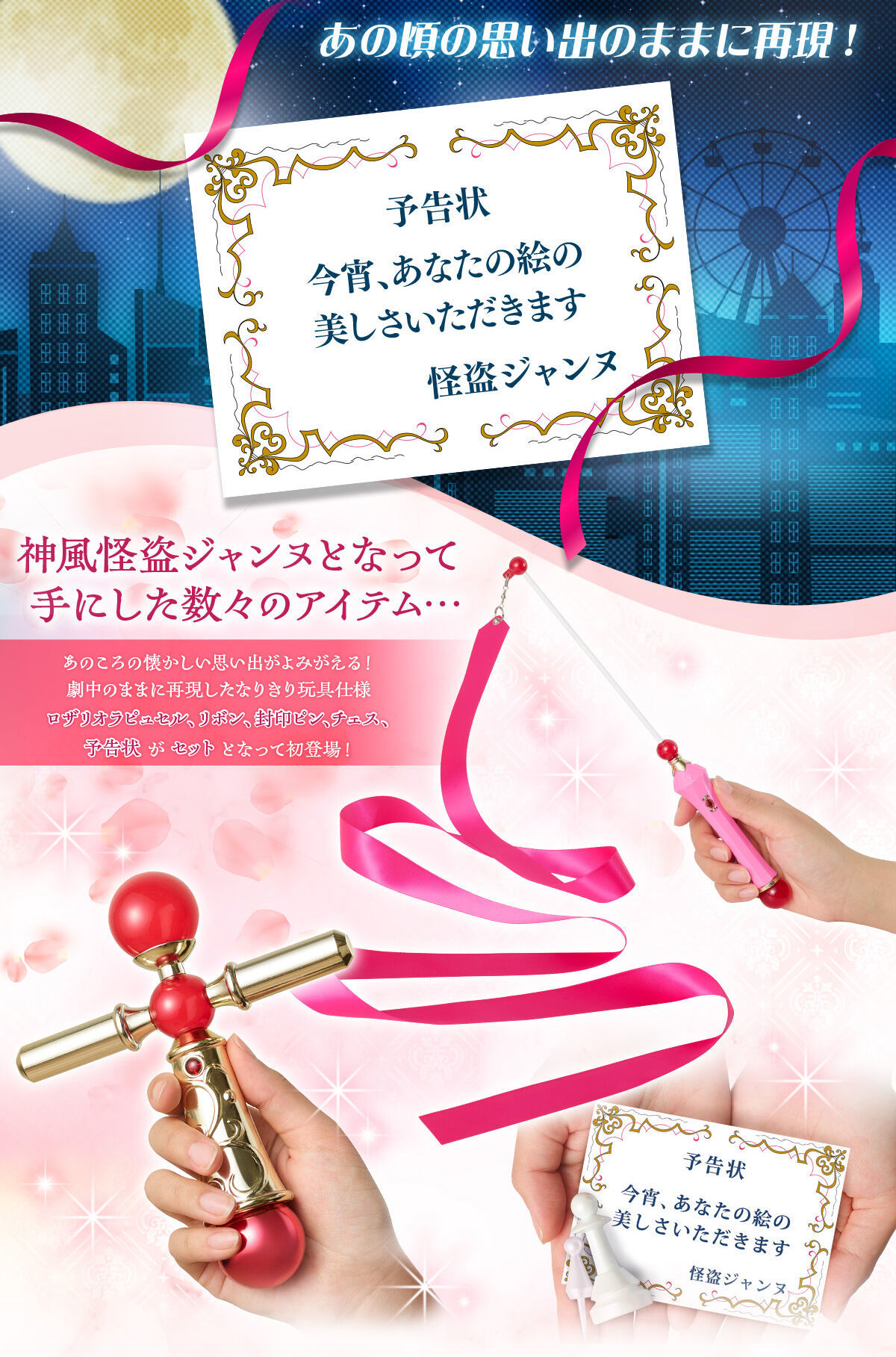 「Special Memorize 神風怪盜貞德 玫瑰十字架變身器」道具玩具,將主角的怪盜貞德變身器商品化!除了透過鍍金、透明加工和水鑽精美再現徹底再現變身器特徵的十字架外觀之外,更收錄有使用「絲帶」作為武器封印的狀態,封印後的象棋和行動前的預告信也都收錄其中!可以重現從變身與攻擊等豐富的場景~按下念珠體上的按鈕,還會發光,勾起人們對當年的懷舊回憶。