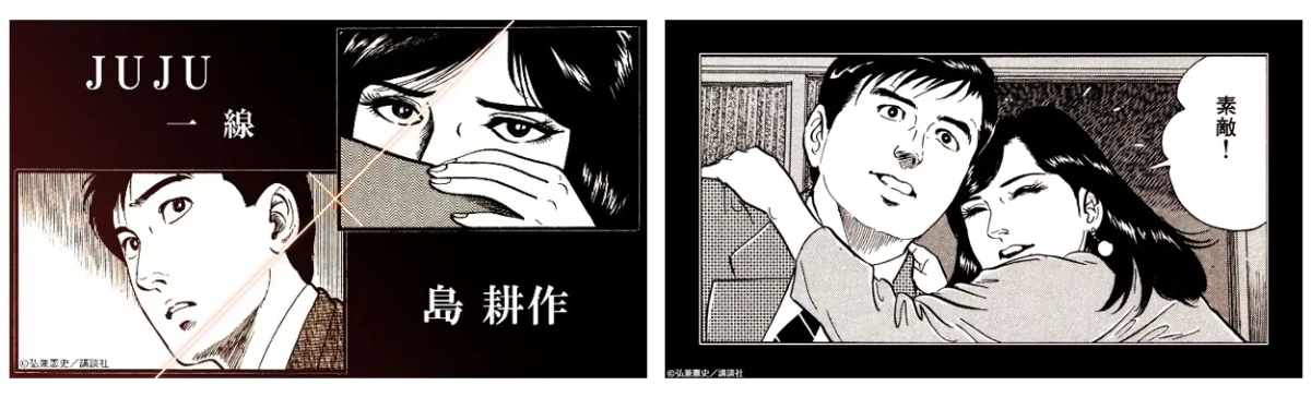 這次 JUJU 最新單曲「一線」,能跟弘兼憲史的《島耕作》合作,JUJU 感到十分榮幸,自己也是忠實粉絲的從來沒有想過有一天劇中人物島耕作跟大町久美子 會出現在自己的音樂 MV中。