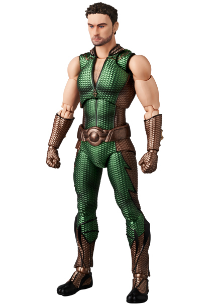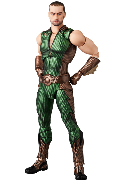 本次商品全高約 16 公分,重現潛水王在作品中的造型,銅綠配色佈滿鱗片的超級英雄服裝以珠光漆呈現反光效果,頭雕仔細的還原了演員柴斯·克勞福(Chace Crawford)的長相,並附上了三款不同的頭雕,包括在英雄生涯失意後剃掉頭髮的形象,配件部分附上了剃頭髮時使用的剃刀以及加入宗教團體「合作教會」後代言的飲料罐,讓各位玩具人可以在家中重現潛水王的各種有趣動作!
