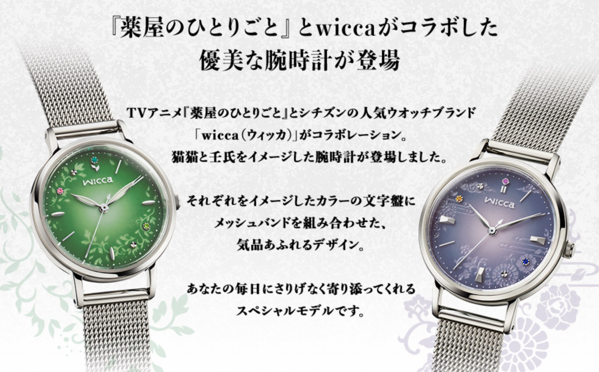 源自日本鐘錶品牌 CITIZEN 的日系血統,結合時下最可愛的元素,俏麗時尚的設計, 旗下以女性顧客為客群的子品牌 Wicca。近日宣布與昨日 ( 3/23 ) 播出本季最後一集,頗具人氣的動畫《藥師少女的獨語》合作,推出以貓貓 & 壬氏為主題的聯名手錶。售價為 40,480 日圓,預計將於 2024 年 9 月下旬上市,限量各 2000 組。