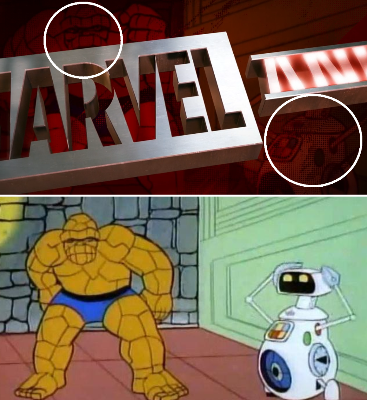 另外也出現了1978年《驚奇四超人》卡通的石頭人;而右下角的機器人名為 H.E.R.B.I.E.,是當年礙於「霹靂火」有計畫要推出真人電影所以無法使用(另有一傳說,是為了防止低齡觀眾效法霹靂火而自焚)所以創造了這個機器人充當第四成員: