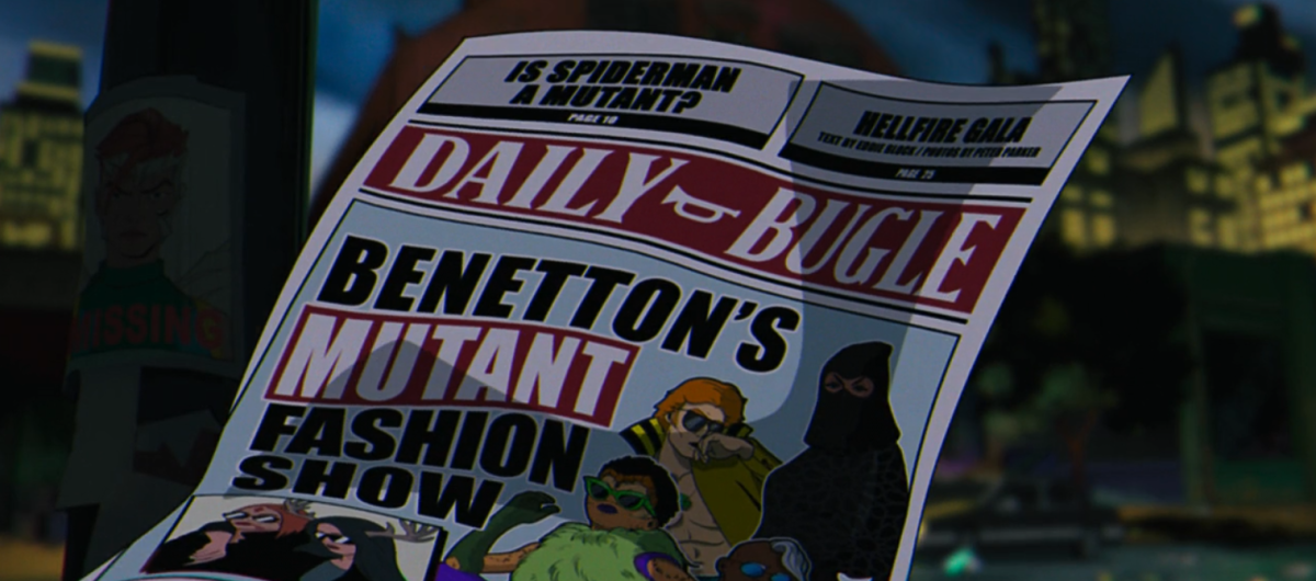 報紙的頭版標題是『班尼頓的變種人時裝秀(Benetton's Mutant Fashion Show)』,1965年創立的義大利品牌「班尼頓」最知名的就是其摒除地區、種族、語言之隔的理念,並致力於各種社會、政治、人權以及多元文化的廣告。 因此在動畫的宇宙中,班尼頓這個講究跨越種族與多元文化的廠牌,自然會採用變種人作為模特兒為其發聲。