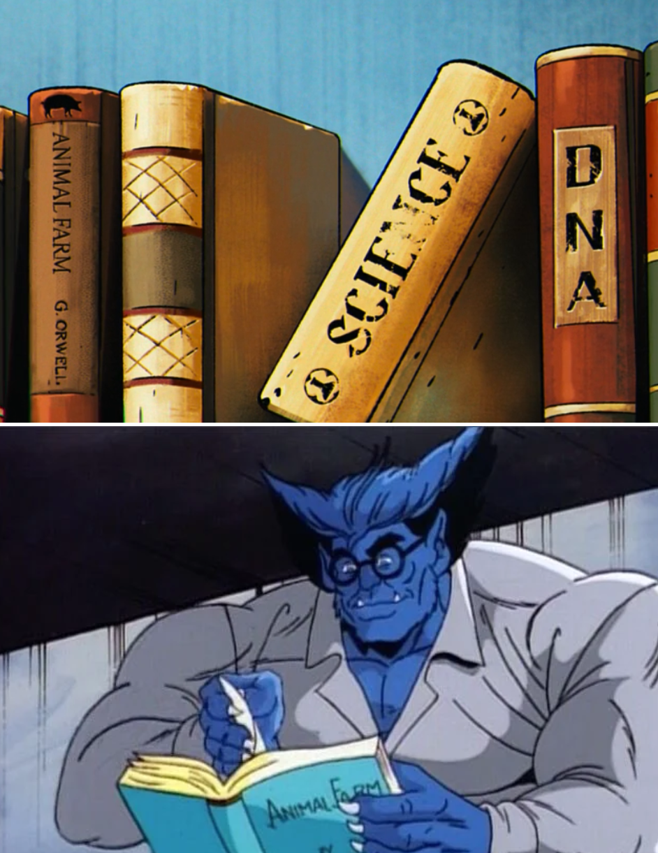 9. 野獸的藏書 書櫃上可以看到《動物農莊》等經典文學藏書,很明顯就是野獸的蒐藏。在原版卡通第一季第三集,野獸被逮捕關押後,就在監獄裡看《動物農莊》這本經典文學。