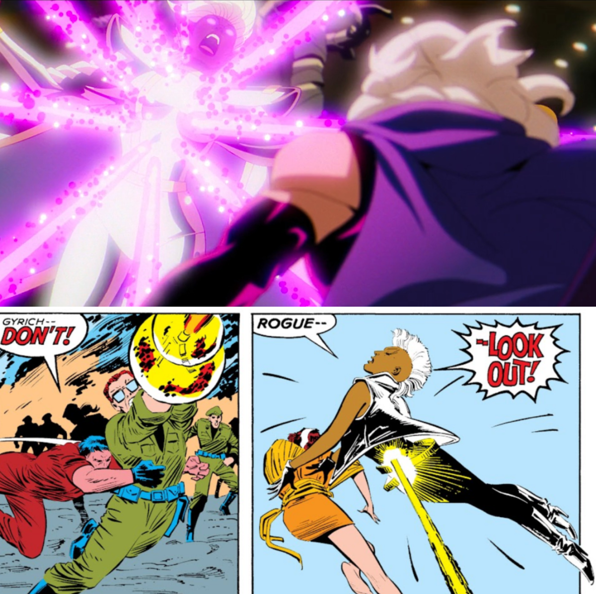 17. 暴風女失去超能力 為了拯救萬磁王免於「X-行刑者」的攻擊,暴風女犧牲了自己導致失去超能力,這也使得萬磁王失去理智,當眾制裁X-行刑者。 暴風女失去超能力的這一段情節,改編自漫畫《The Uncanny X-Men》#185 期中,亨利蓋瑞克(也就是卡通中殺死 X教授的兇手)用一種特殊武器射殺小淘氣,這種武器可以立即剝奪變種人的能力,但是暴風女卻自己承受了攻擊,於是失去了超能力。
