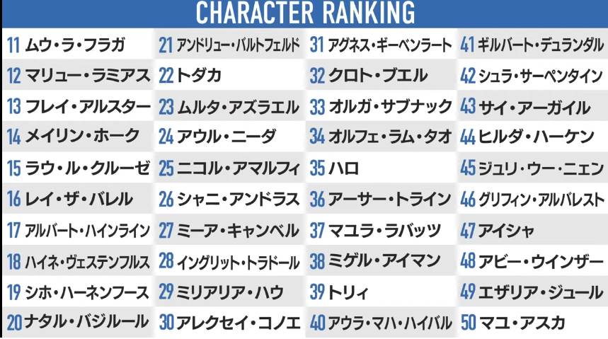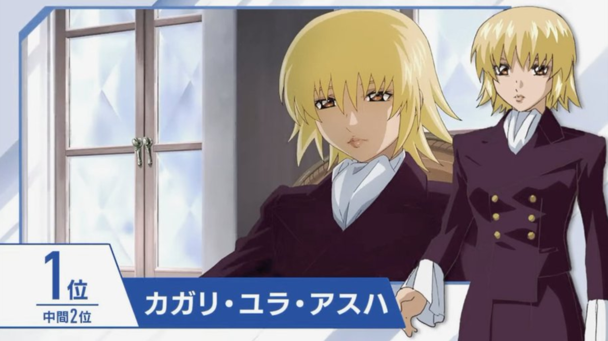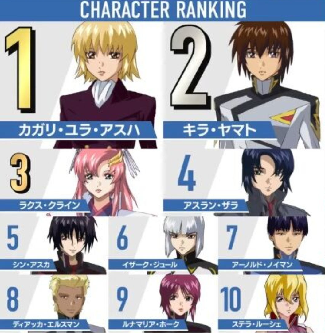 角色人物的人氣排名,讓不少人跌破眼鏡的是原本在中途公開第一名的主角-煌·大和,居然被超車成為亞軍,第一名由卡佳里·由拉·阿斯哈登上,也是官方多年來首次拔得頭籌。