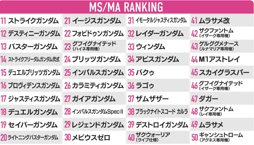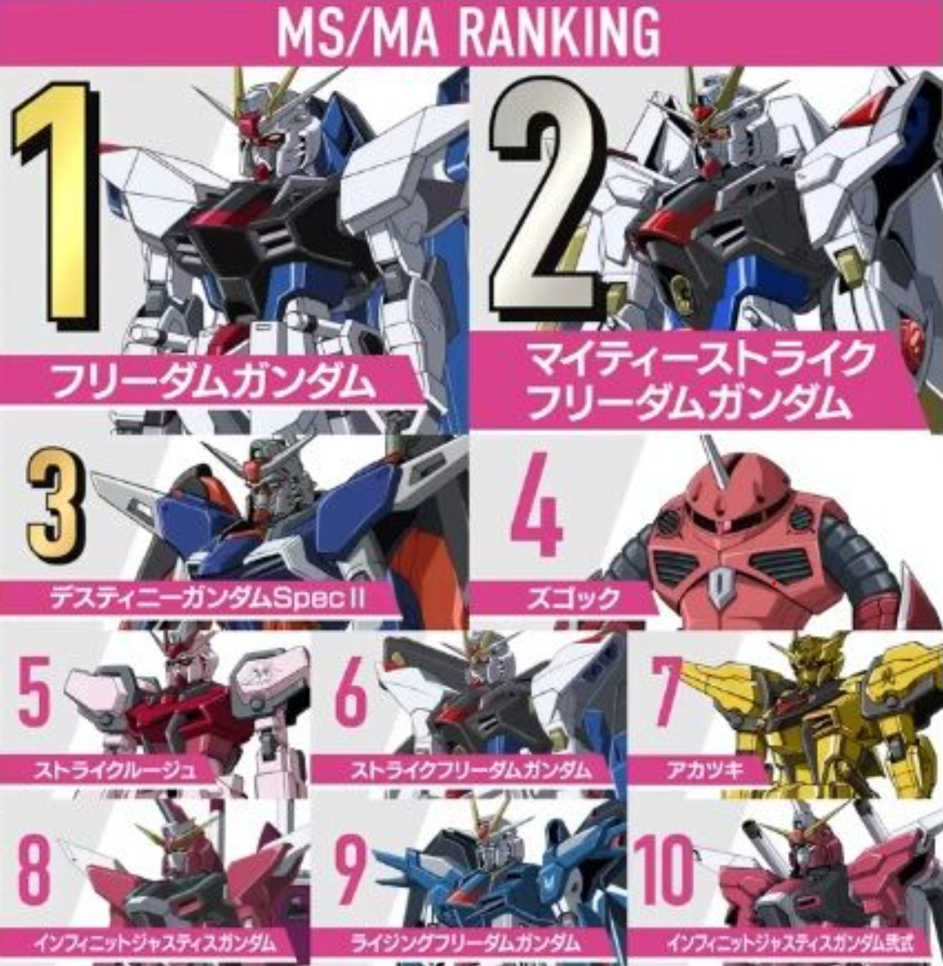 至於機體的人氣排名,不意外的由一直以來都被粉絲喜愛的自由鋼彈奪冠,第二名由劇場版的最後登場的全能攻擊自由鋼彈奪下,第三則是命運鋼彈SpecⅡ,第四則由劇場版登場讓人驚豔的茲寇克奪下。
