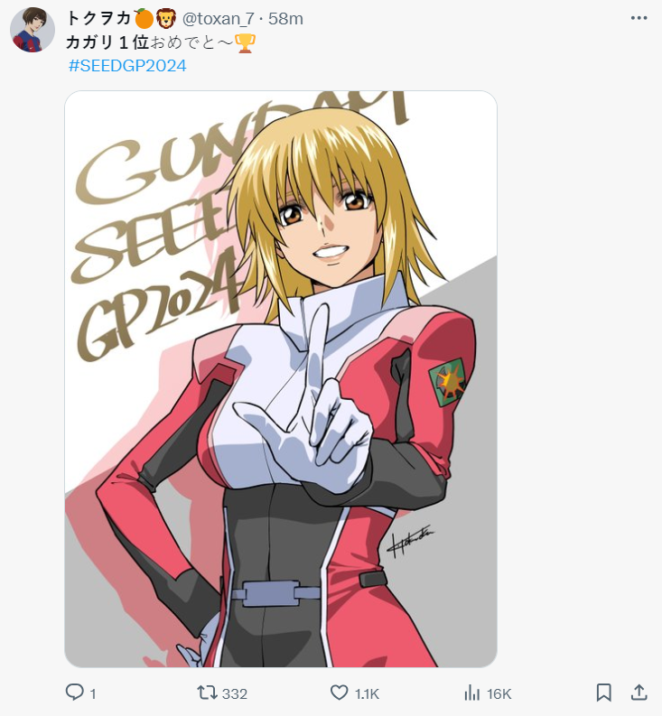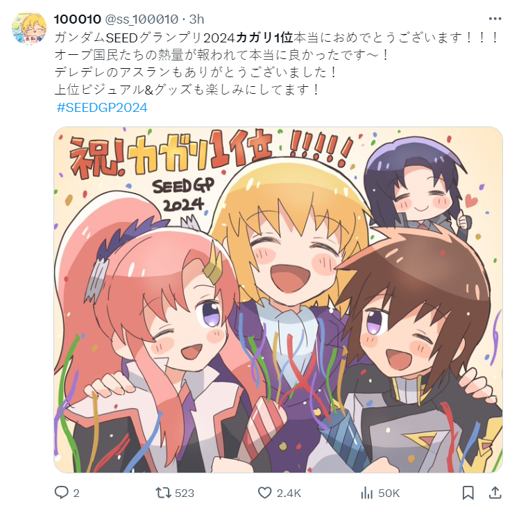 「機動戰士鋼彈 SEED GP2024」人氣投票從 2 月 5 日起到 2 月 25 日截止,總計 127 位角色以及 102 架機體之中,讓粉絲自由投票選出兩部分的最高人氣排名。