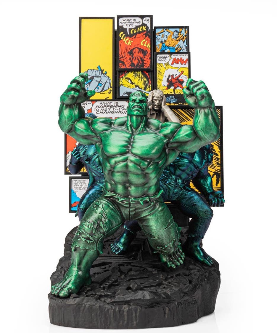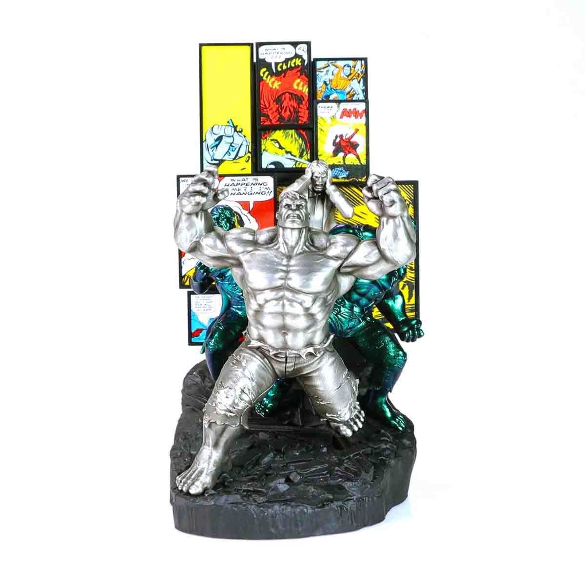 本次的「綠巨人浩克起源 伽瑪版」錫製收藏雕像全高約 25.5 公分,維持皇家雪蘭莪漫威起源雕像系列一慣的漫畫風格,呈現布魯斯班納半身露出,從漫畫中走出來的樣子。由小而大以四尊錫製雕像的方式呈現出布魯斯班納變化成浩克的過程,顏色從金屬銀色漸層轉變為金屬綠,細緻的刻畫了體態上肌肉線條的轉換以及變身時布魯斯痛苦的神情,展現浩克精彩的變身畫面!
