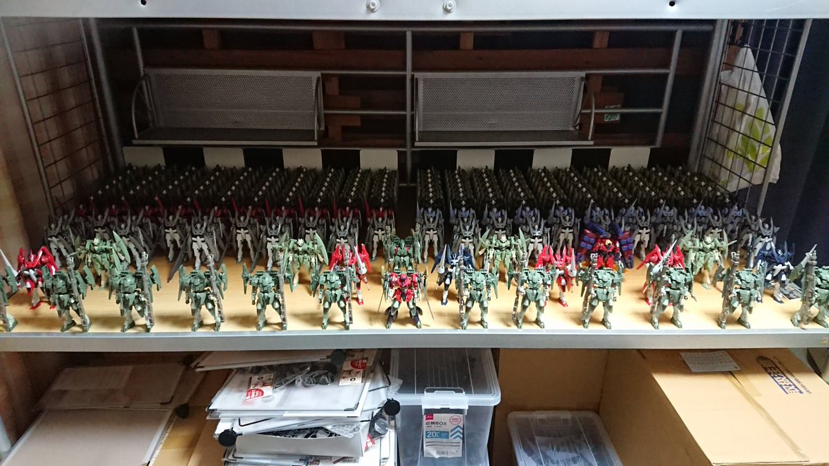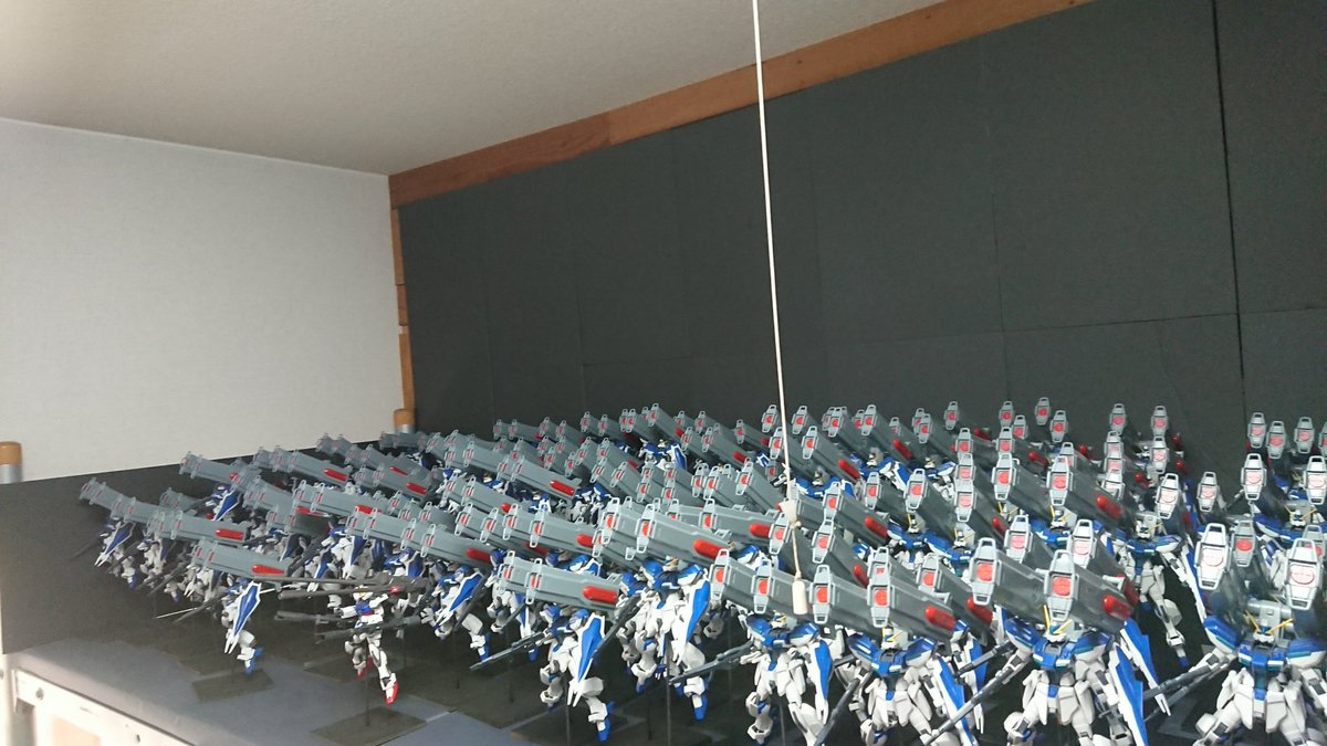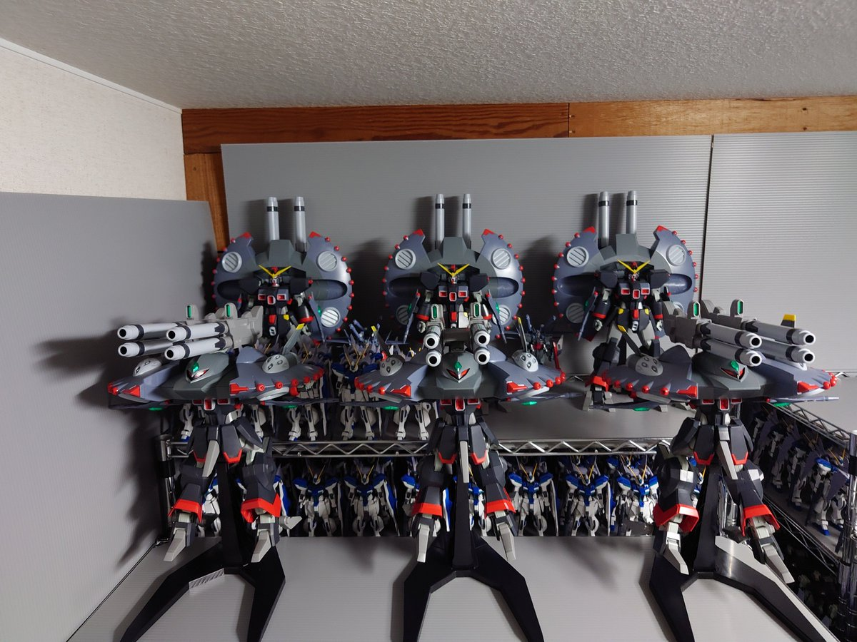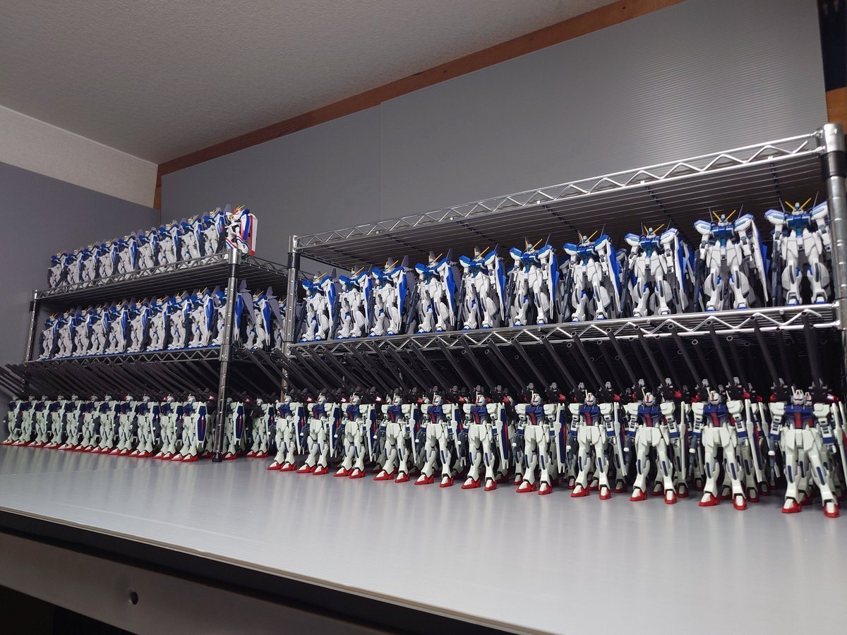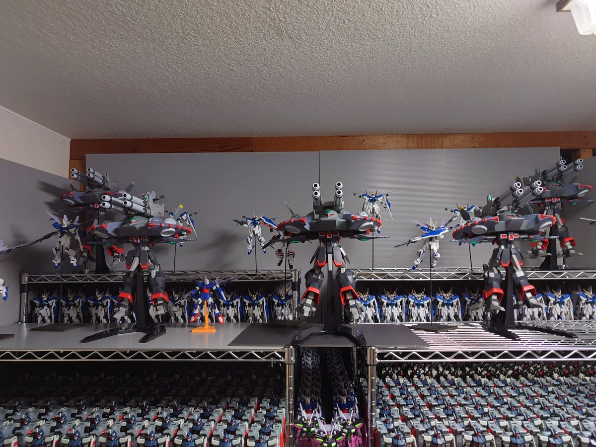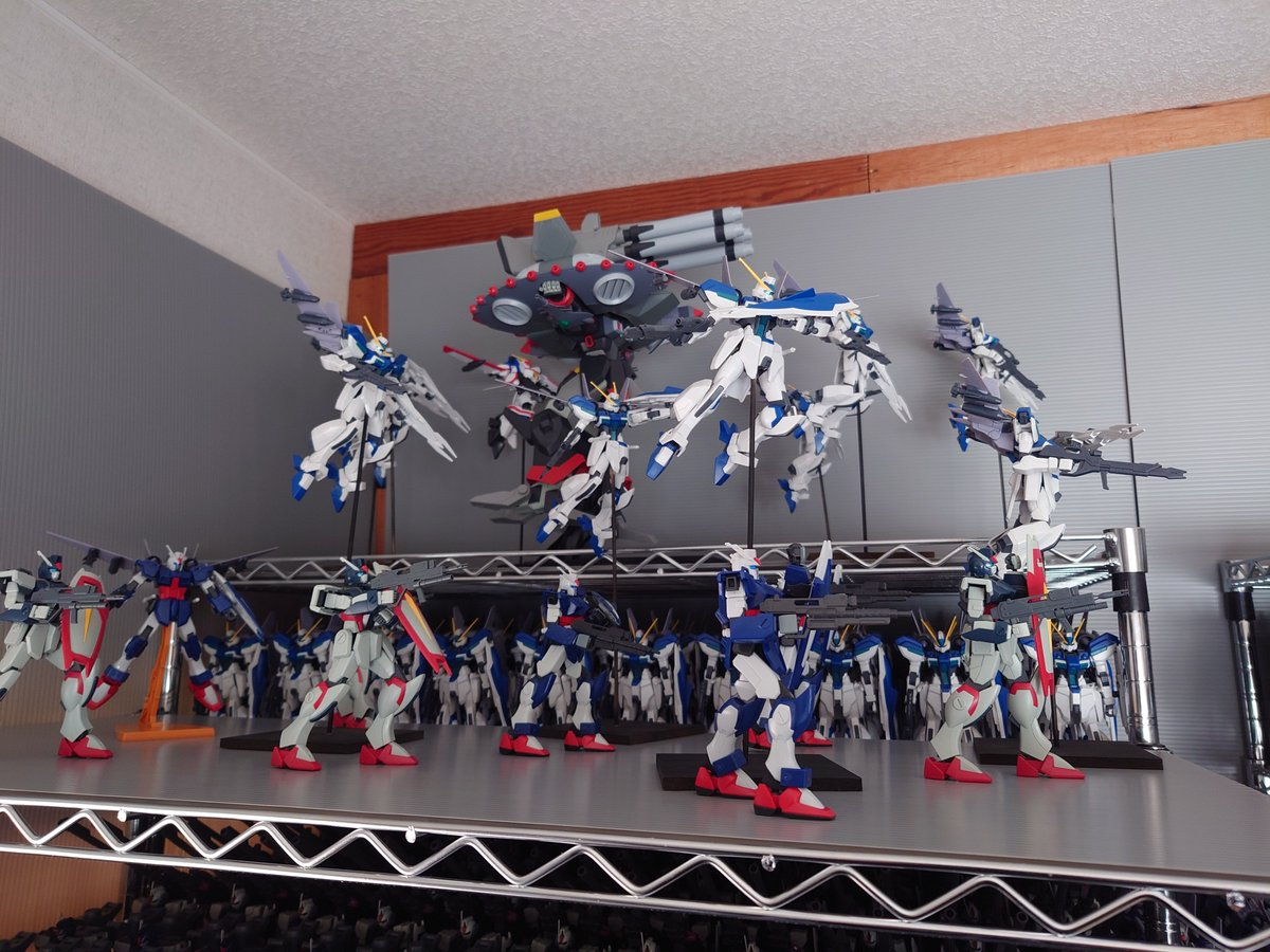 光是《機動戰士鋼彈SEED》的 GAT-01 攻擊刃(Strike Dagger)就有超過一百隻,GAT-04 威達(Windam)更有兩百多隻,最近還狂買三月剛發售的「HG 1/144 GFAS-X1 破滅鋼彈」,全部擺在一起真的讓人覺得像是動畫中的戰爭場景。