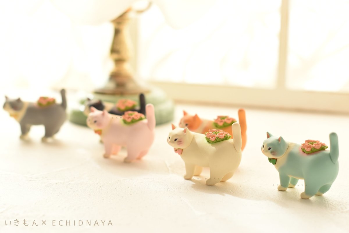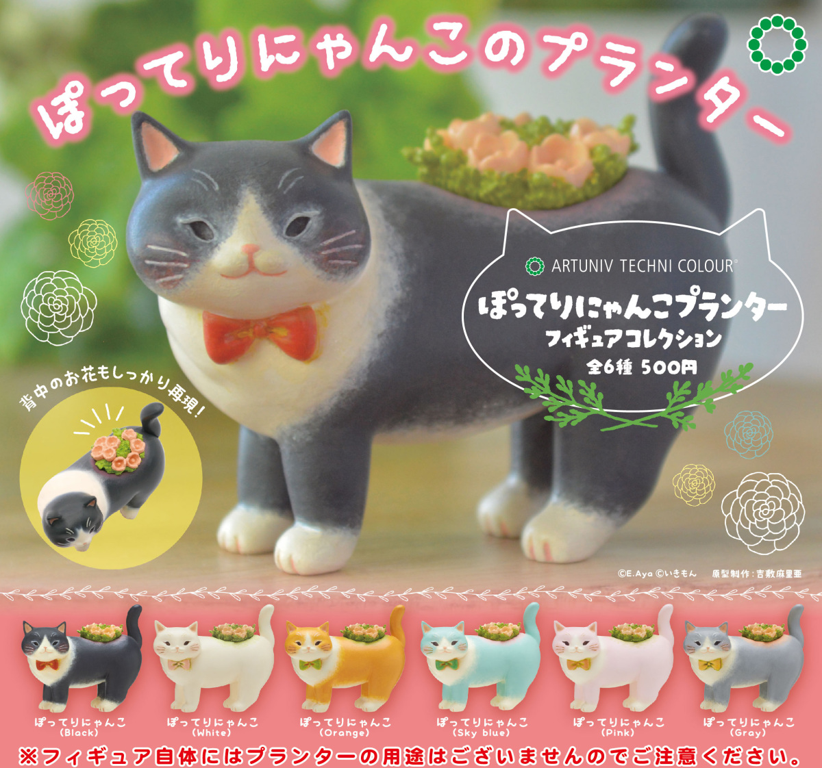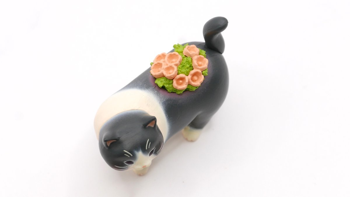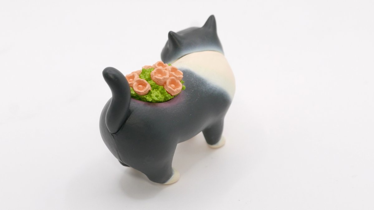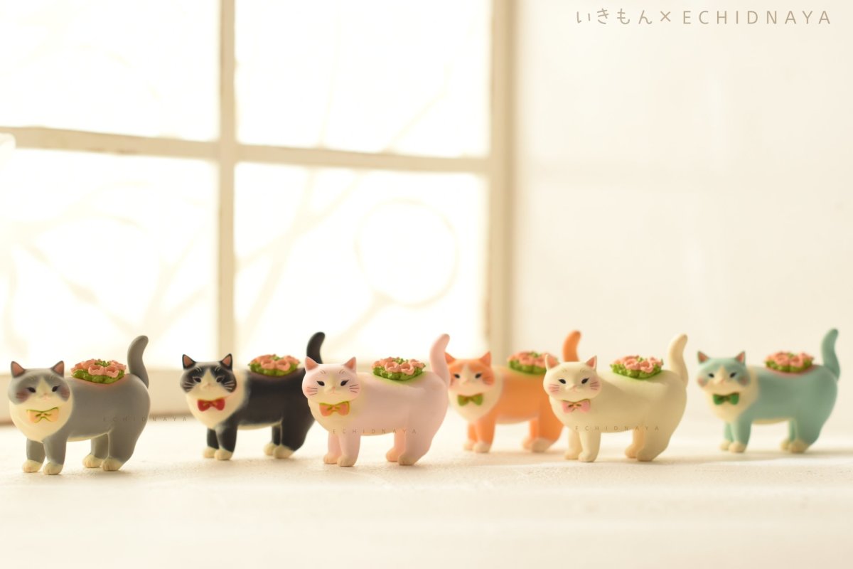 「胖嘟嘟貓咪花盆轉蛋」以小巧可愛的轉蛋規格忠實還原 Echidna Aya 所設計的造型,製作出貓咪肥肥的屁股、圓滾滾的身軀以及帶有可愛微笑的表情,背部特徵的花草植栽則改為塑膠模型呈現。此套轉蛋共有黑、白、橘、天藍、粉紅、灰等六種顏色的貓咪,藉由色彩塗裝再現了原版的溫暖色調與獨特筆觸。