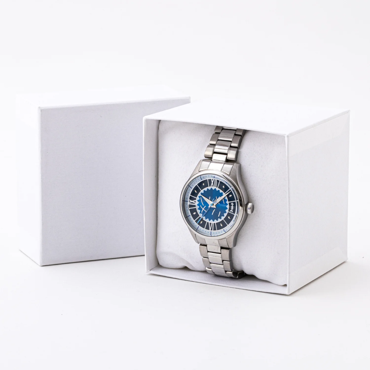 錶盤背景以鯊鯊的初代服裝為靈感設計,裏頭還藏有尾巴的圖案,秒針處用鯊鯊手持的三叉戟來作為特色點綴,三點鐘處有著魚骨頭圖案,錶背還印有吉祥物 Bloop 的圖案。