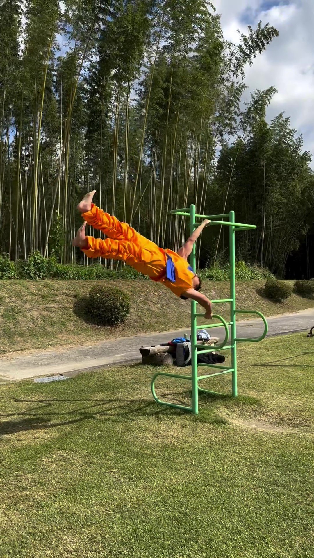接著雙腿擺動彷彿在空中走路一樣,身體慢慢呈倒立的樣子,再慢慢走下來回到一開始雙腿與地面平行的狀態,就這樣靠著手支撐,雙腳在空中走了一圈,感覺在他周圍似乎沒有重力一樣。