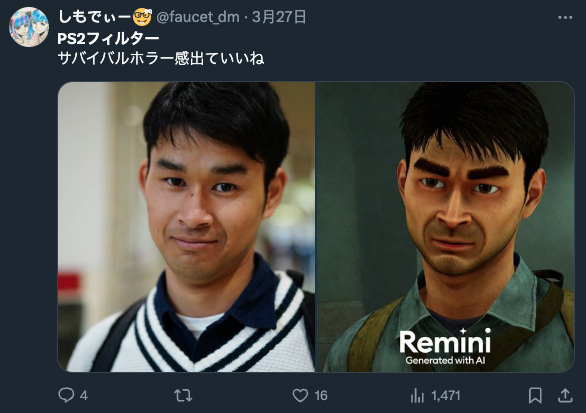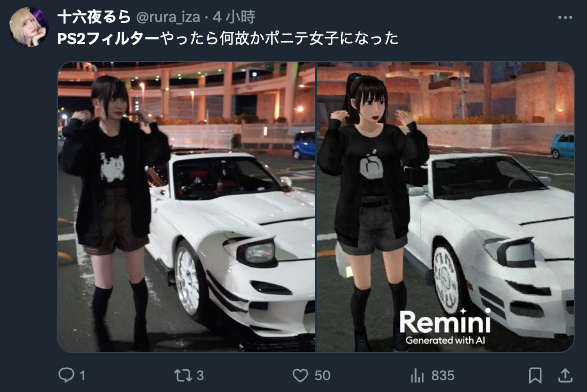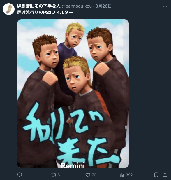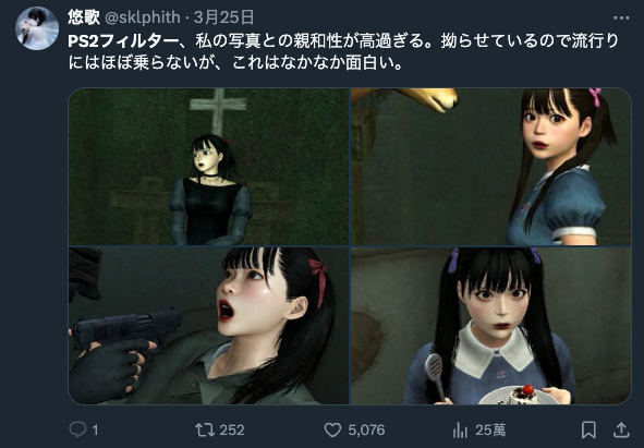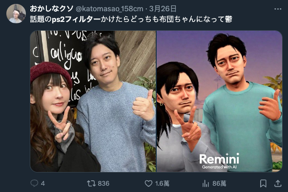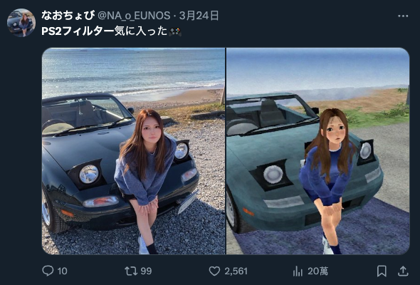 目前只要用「PS2フィルター」(PS2濾鏡)當作關鍵字在X搜尋,就可以看到非常多網友的試玩成果。雖然說依照照片本身的適合程度,輸出成果的「PS2感」會有所不同,但大致上成果都相當不錯。也或許是因為這樣,這個「PS2濾鏡」才會這麼受到好評。