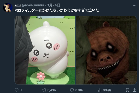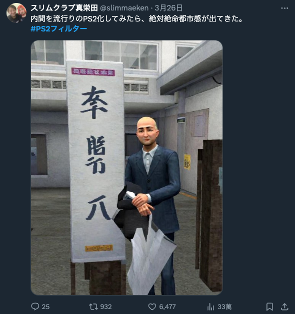 近日日本網友們正在熱烈討論的「PS2濾鏡」,其實是透過AI算圖後,能將任何照片加工成彷彿「多邊形數量很少」的3D模組模樣。而因為這個質感實在是太像PS2時代的遊戲了,日本網友們就將其稱為「PS2濾鏡」,而且玩得不亦樂乎!