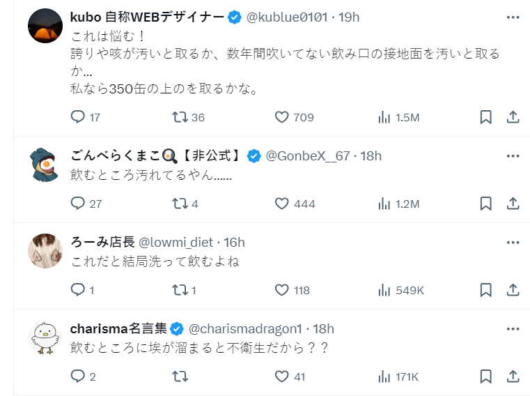 後續有網友指出,其實這是為了衛生問題,由於鋁罐不像一般瓶裝可以隔絕灰塵,喝的開口在拉開拉環後還是有可能讓嘴巴接觸到鋁罐的上緣,如果沒有清洗乾淨很容易連灰塵一起喝下去,所以才用這種方式,避免灰塵堆積在鋁罐上緣,不少曾在賣場工作的朋友都有經驗這樣陳列。