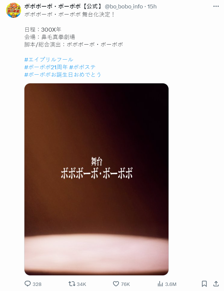 在今年迎來 21 周年,雖說有不少企劃,但在今日 ( 4/1 ) 愚人節這天,突襲公布了要製作真人舞台劇「超ハジケステージ☆ボボボーボ・ボーボボ」,讓不少粉絲感到困惑,這到底是不是真的,官方這操作真的讓人難以捉摸。