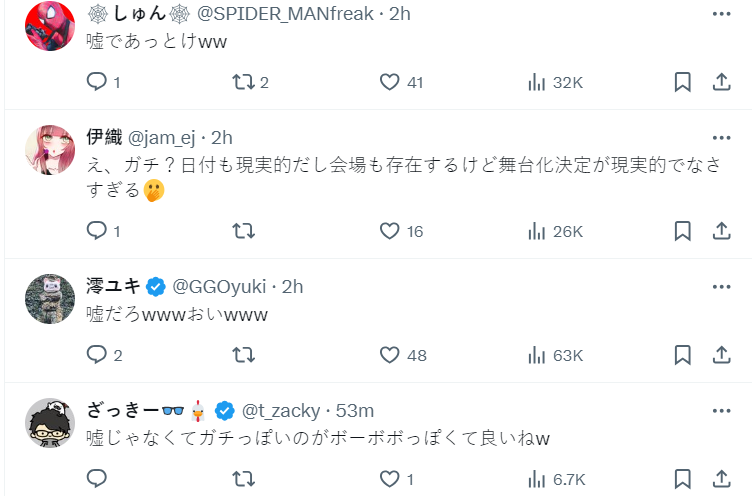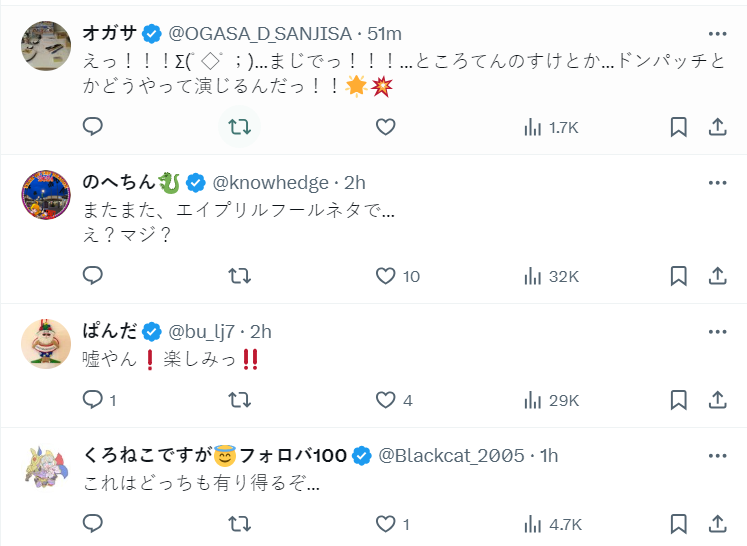 會有這樣的困惑,是因為前一天 ( 3/31 ) 官方就預告舞台劇製作確定,但打上日程 : 300X 年,在鼻毛真拳劇場舉辦,搭配エイプリルフール的 Hashtag,很明顯的這是個愚人節玩笑。