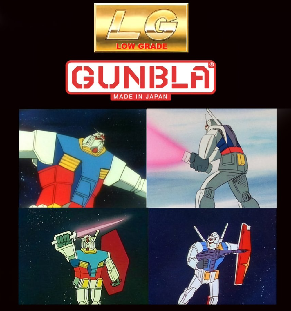 所謂「LG,LOW GRADE」就是對應鋼普拉產品線的 EG、HG、MG、RG 等型號,想說以作畫崩壞的概念製作「低品質」的模型產品,也把原本的 GUNPLA 更改成 GUNBLA,雖然很鬧但這個概念似乎不少人覺得有趣買單。