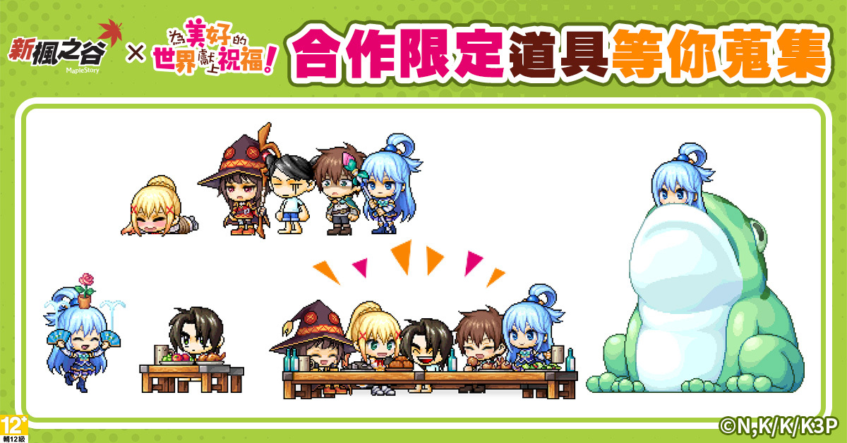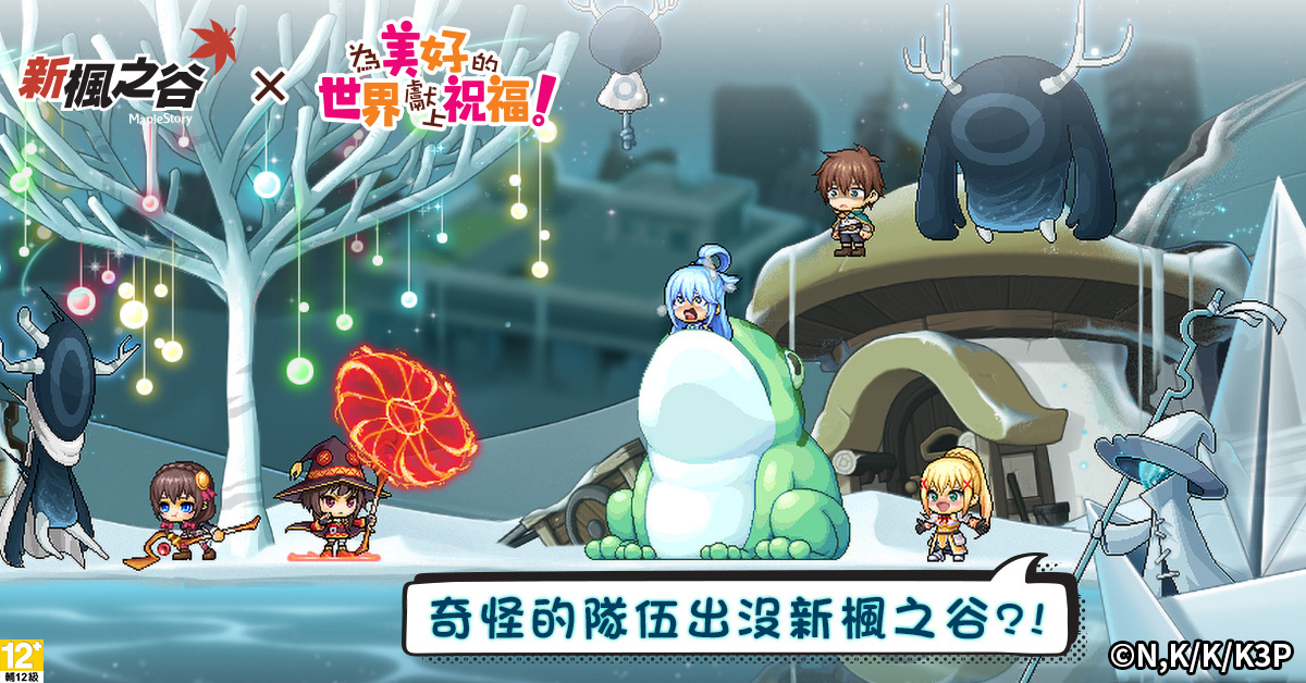 睽違四年,《新楓之谷》再次跨界攜手日本動畫IP,與超高人氣動畫《為美好的世界獻上祝福!3》聯名合作。某天,楓之谷的世界突然出現奇怪的隊伍,原來是動畫中主要角色來到楓之谷世界修練!由極其平凡的和真為首,帶領阿克婭、惠惠、達克妮絲等人,決心重生為更加堅強的團隊,需要各位玩家的支援!