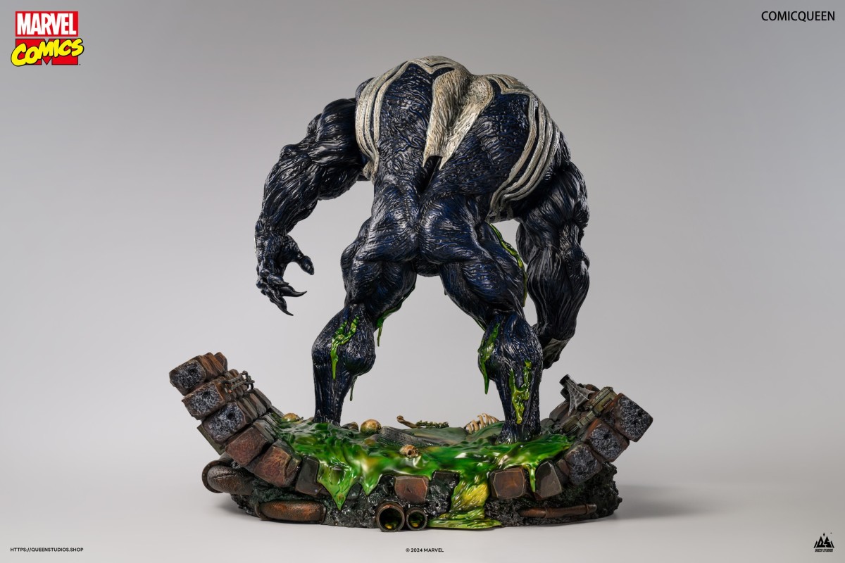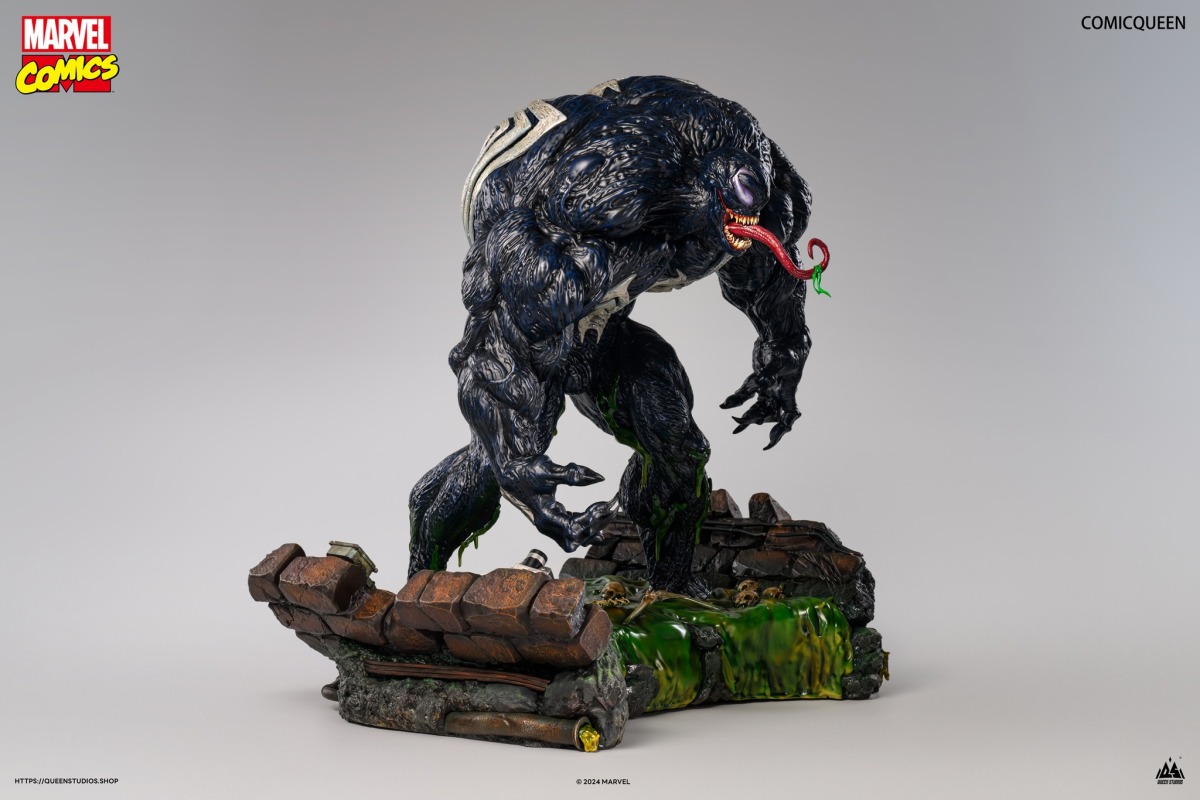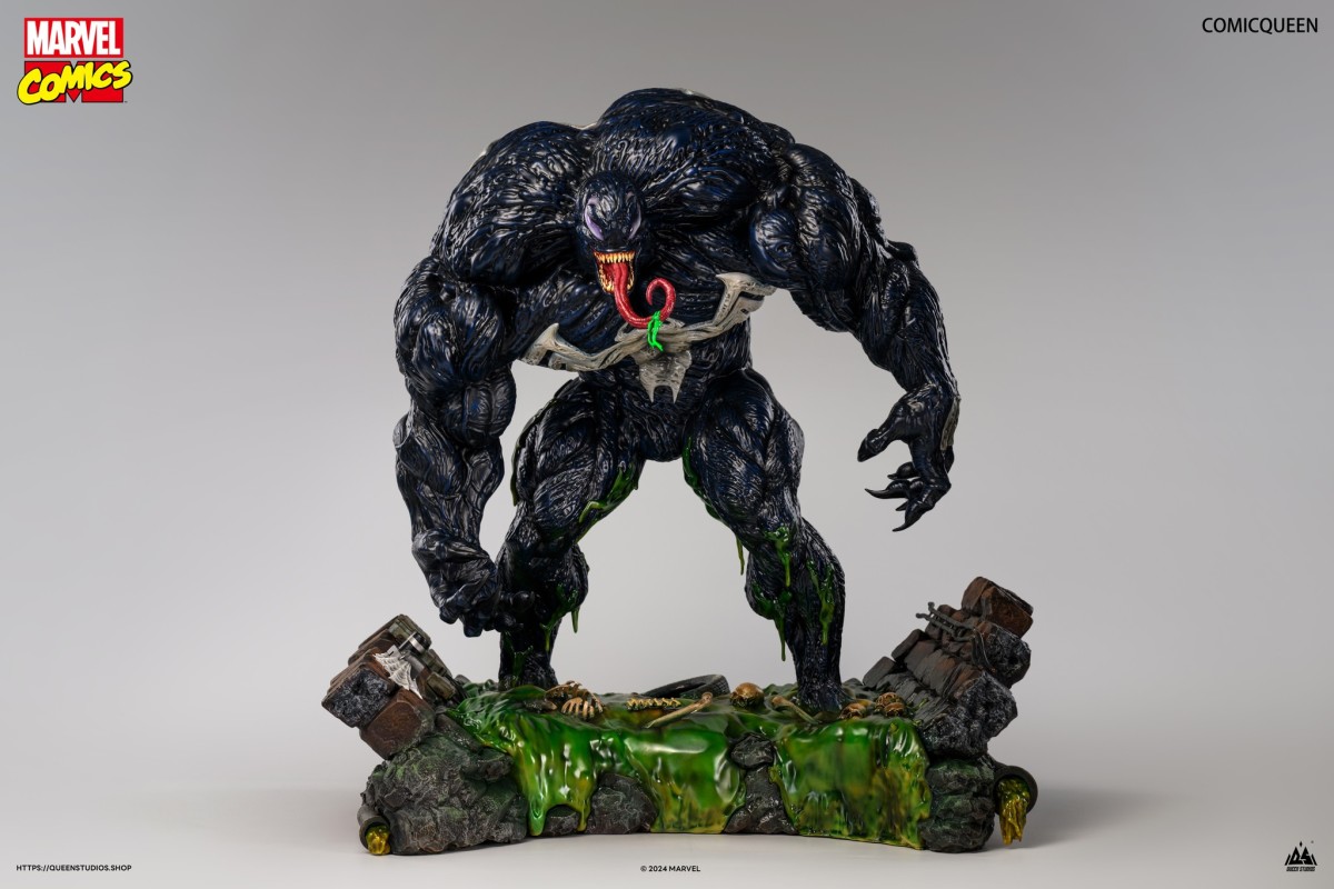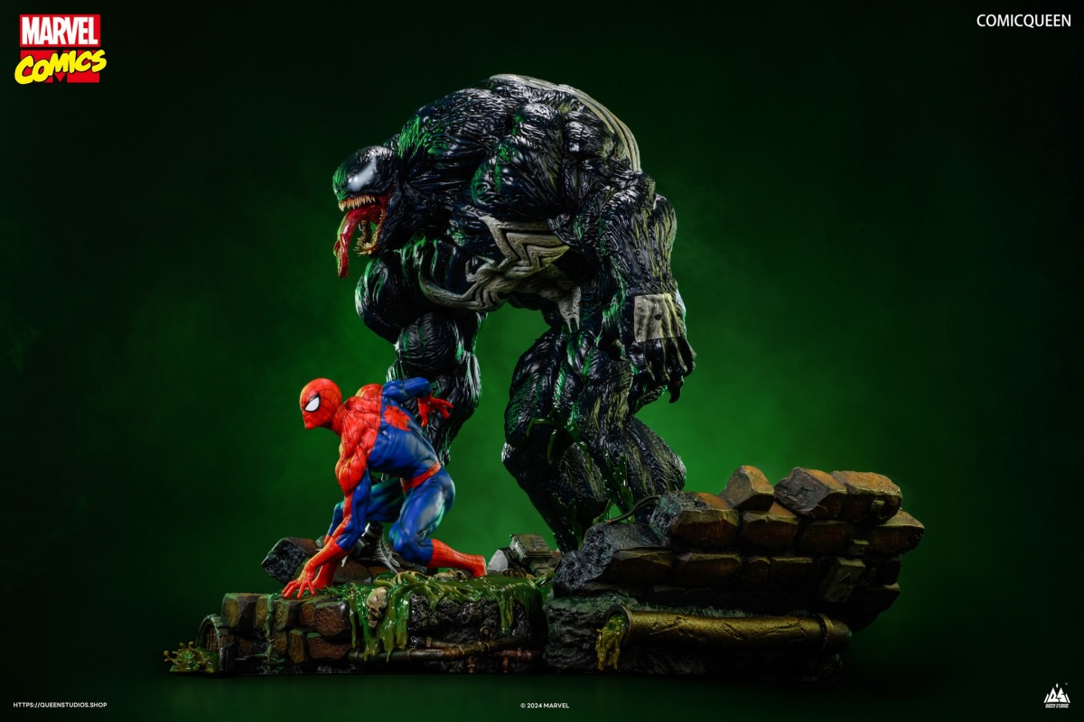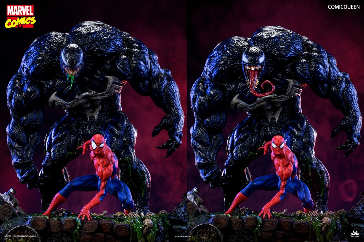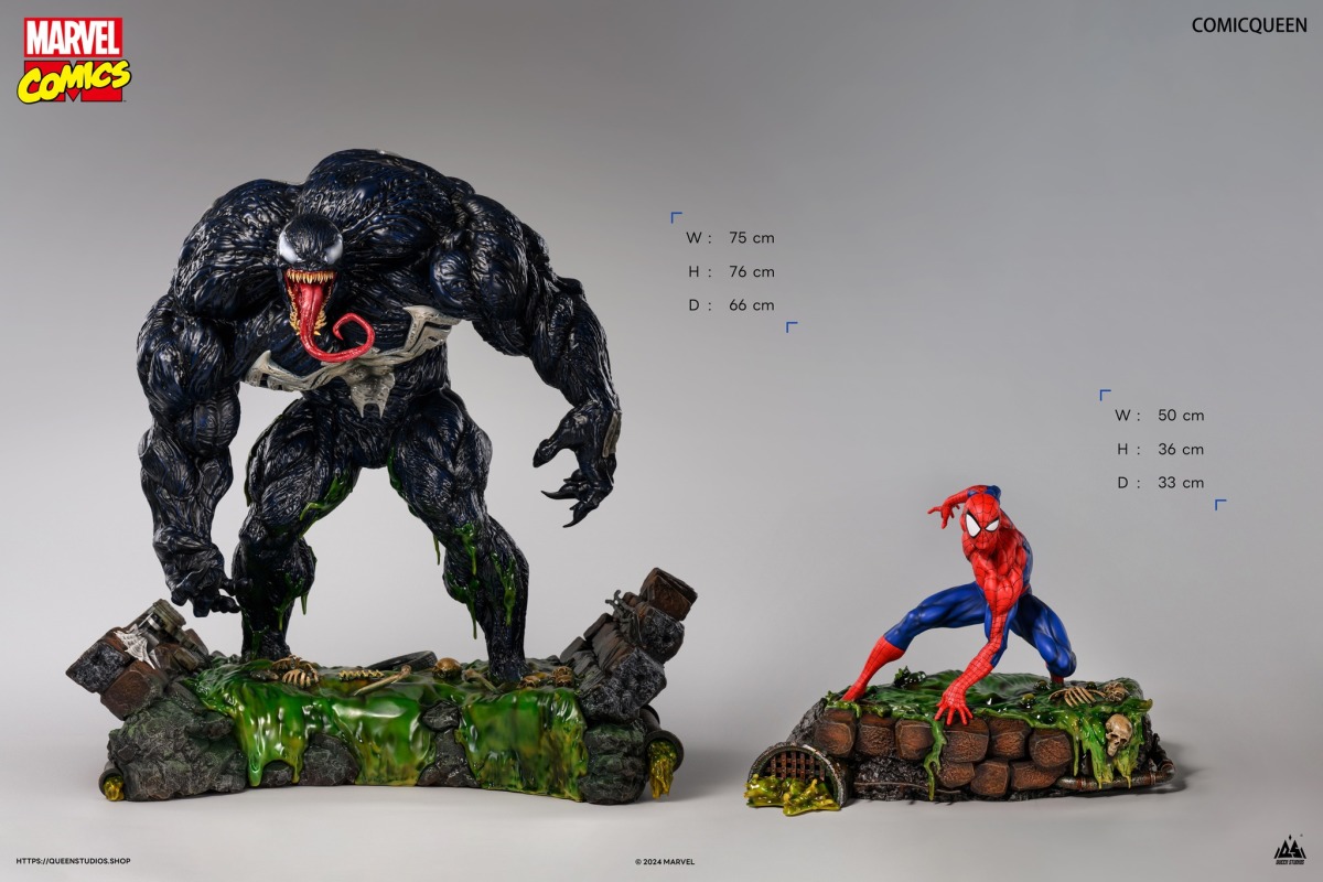 一次收錄 MARVEL 經典宿敵組合的「蜘蛛人 vs 猛毒」雕像高約 76 公分,是由 Queen Studios 製作團隊與 Emiliano Calderon、Erick Sosa 攜手打造,蜘蛛人的雕刻是由 Emiliano Calderon 負責、巨大魁武的猛毒則是 Erick Sosa 操刀原型,蜘蛛人本體呈現出經典的蹲姿,並將緊身衣下的肌肉形狀生動形塑,而在彼得身後、散發出沈重壓迫感的猛毒更是無比誇張的存在,遠超常人的壯碩肉體、無法忽視的血盆大口與猖狂舌頭、極具生物感的混濁白眼,以及覆蓋體表的共生體紋理都十分驚人。