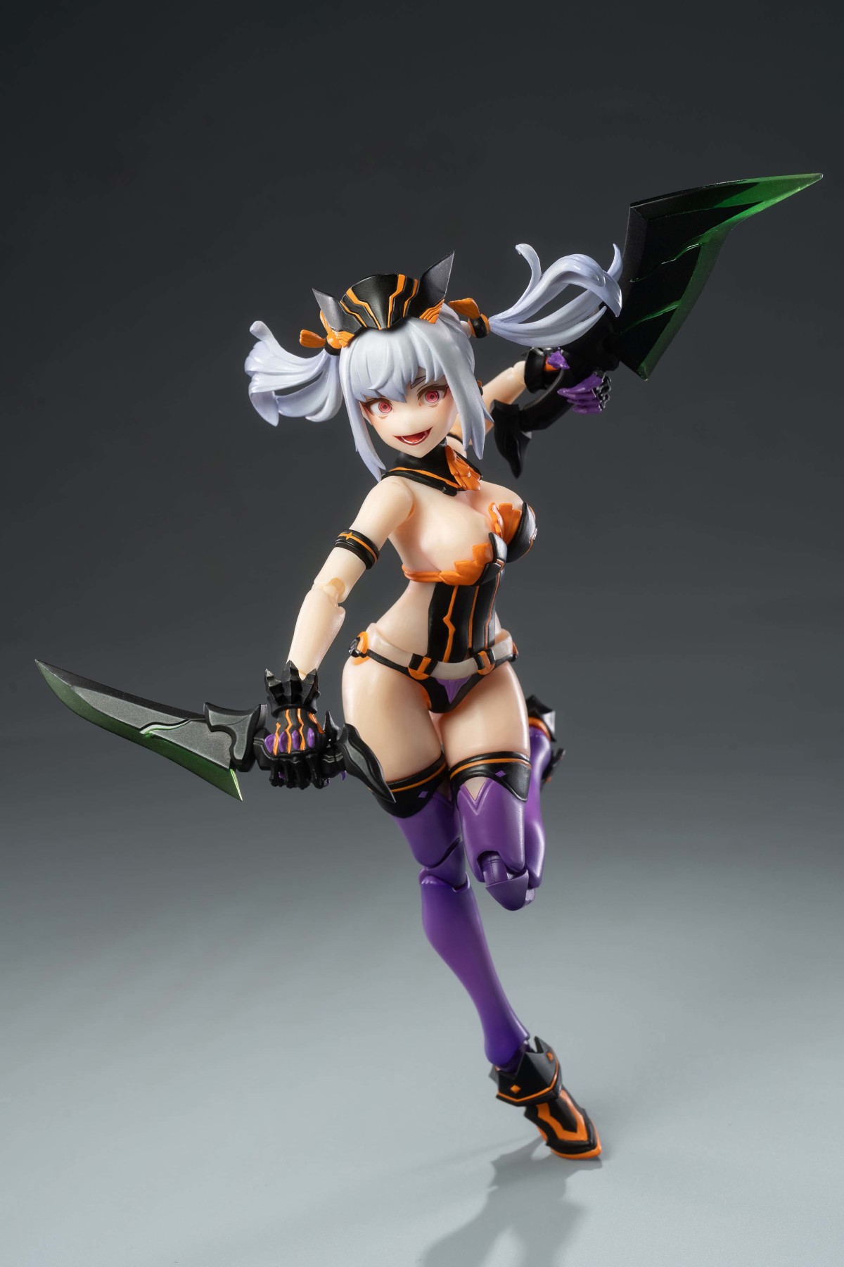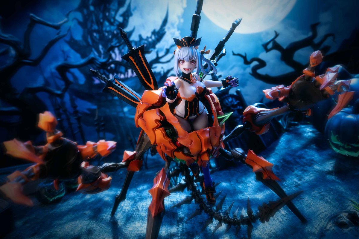 擁有全組合後高達 20 公分的超大份量南瓜裝甲武裝形態,最大臂展更達 45 公分!除了複雜的分件、精細的塗裝之外,可動關節更超越 100 處!雙手手指、如外露脊椎骨骼的尾部都能細緻地動作,相當驚人。另外更有超級豐富的配件—血腥的骷髏頭、棒棒糖、口罩,以及六款鋒利恐怖的刀具,凸顯南瓜公主怪誕的性格與造型;替換手勢零件也來到 10 款。頭部內藏有磁吸,可以配戴帽子,另外還有 4 個可以安裝馬尾的零件孔,組合自由度極高!