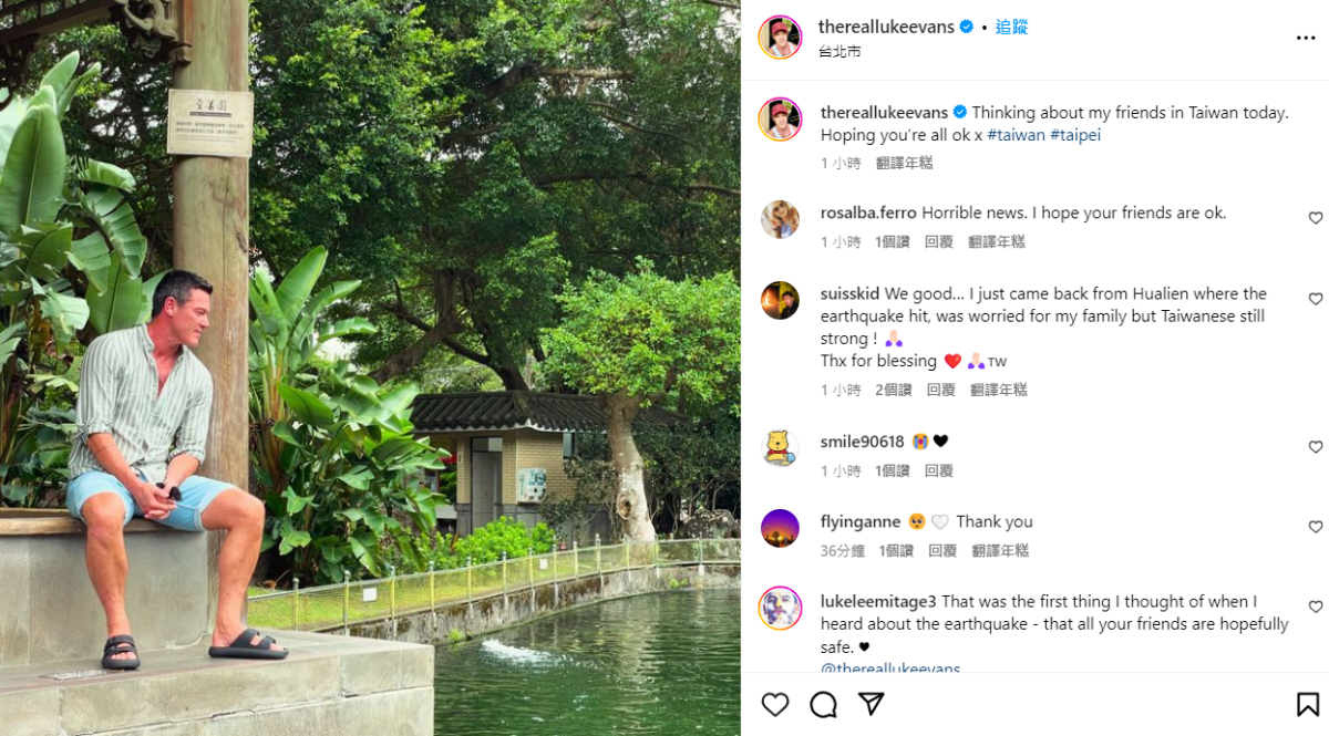 今日稍早,路克伊凡斯上傳一張去年來台期間,造訪故宮博物院拍攝的照片,並寫上對台灣震災的關心:「想著在台灣的朋友們,希望大家都平安。」
