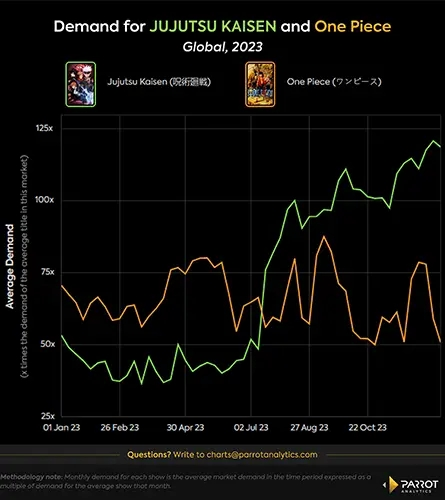 ▼ 從數據圖來看,咒術迴戰原先是落後航海王的,但 7 月動畫開播後就超越且居高不下。