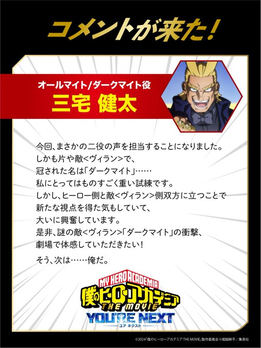 最有趣的事情就是「Dark Might」將由原本的歐爾麥特聲優三宅健太一人配音兩個角色,也自嘲 : 「這次意外要負責兩個角色的配音,而且,一方是敵人陣營的「Dark Might」…對長期配音歐爾麥特的我來說,是一個非常困難的挑戰。不過能一次飾演兩邊重要的角色我也非常開心,請期待這次劇場版帶給大家的震撼力。」
