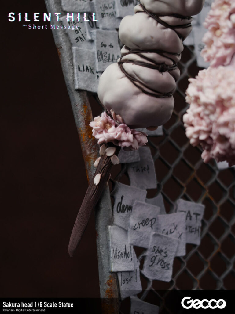 而這款由Gecco推出的櫻花頭(Sakura Head),是以遊戲中會突然出現在主角面前並追逐她的敵人所還原而成的作品,櫻花頭的造型看起來有些像是稻草人,其背後有木竿支撐,雙手也有木尖釘,但是卻以美麗的粉紅櫻花,當做頭部、腰部,還有雙足點綴做為外觀呈現,整體看來雖然漂亮,卻又有些詭異,搭配以寫著各種霸凌字句的小紙條當做背景的地台,更顯得相當有氣氛。