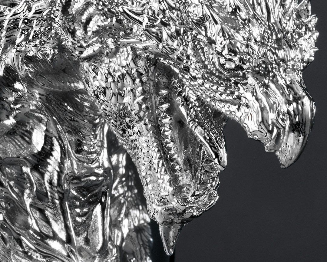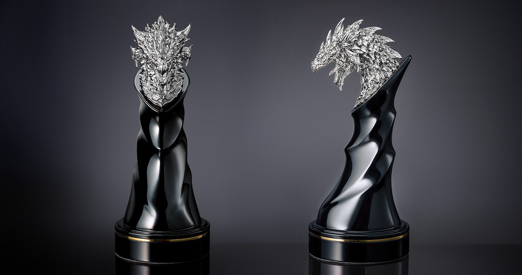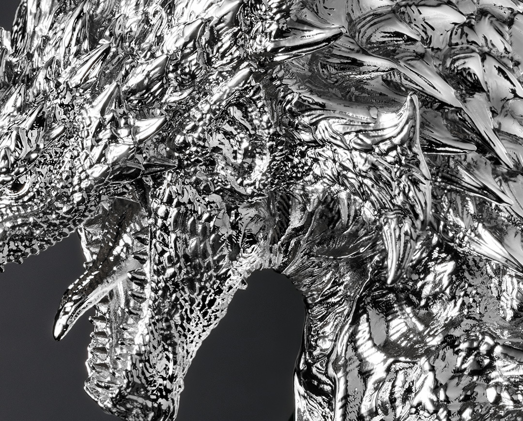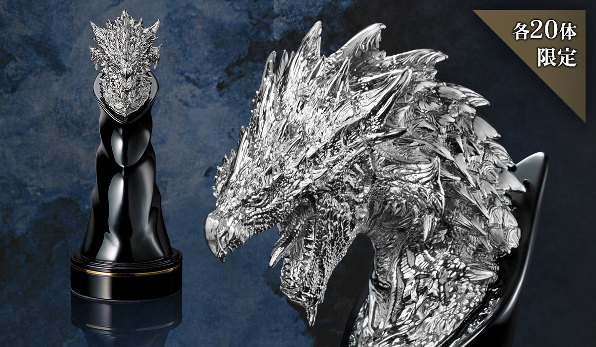 魔物獵人「20週年紀念頭像 銀火龍 利奧雷烏斯稀少種」,由技藝精湛的珠寶工匠根據原型製作而成,尺寸高約 22 公分,精緻地刻劃出火龍充滿力量的眼睛、尖牙利齒的嘴巴、鱗片以及表情都十分注重細節;底座部分採用平滑的流線形狀,讓人想到翼膜的線條,同時調節與頭部的平衡,既帥氣又優雅。並且配有展示專用的壓克力外殼,刻有序號的銀標誌展現收藏意義。
