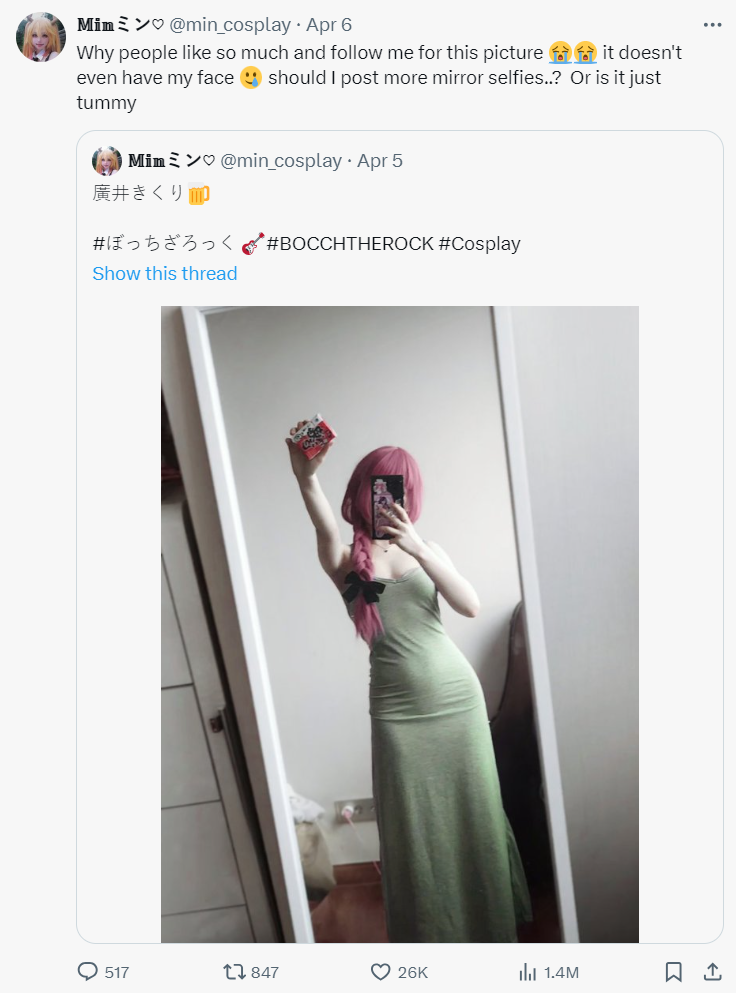 韓美混血的 Coser Minミン,在 Instgram 上有超過 9 萬以上的追蹤,先是在 X 上分享了這張面對鏡子自拍的 Cos 全身照,意外引起廣大網友迴響,甚至在 reddit 上也有不少人分享,連她自己都感到驚訝一張不露臉的照片居然引起關注。