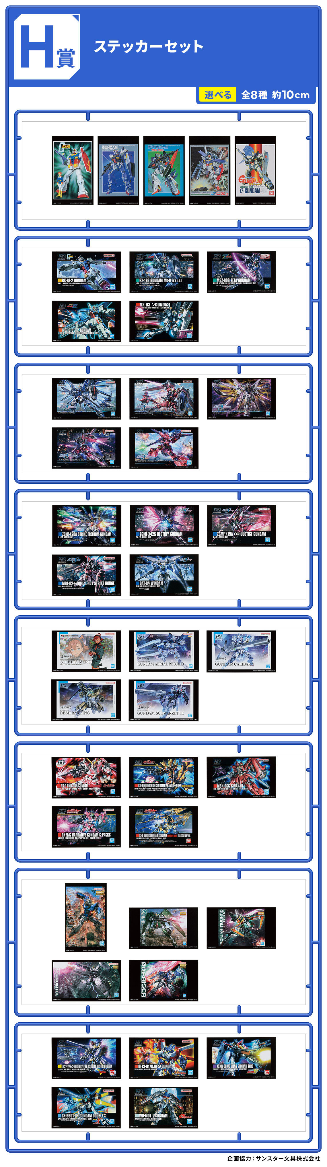等同安慰獎的 J 賞這次也罕見推出鋼普拉改裝用的「配件套組」,包含多種可靈活改裝的武器零件,可製作出不同於原作設定的特殊武裝。而 H 賞「貼紙套組」、I 賞「壓克力立牌」則運用帥氣的鋼普拉商品盒繪進行設計,能在生活週遭隨處裝飾帥氣的插畫。