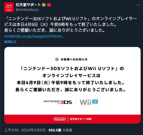 只是既然有網路功能,就意味者需要維護對應的伺服器。任天堂今(9)日則如同事先預告的,在日本時間晚上9點結束3DS及Wii U軟體的網路功能。