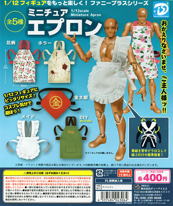 DIS Funny Plus 系列「1/12 迷你圍裙」轉蛋,將圍裙迷你化為約 75 mm 的小尺寸,可以讓 1/12 比例的人偶、玩具穿上可愛的小圍裙~收錄有:小花花圍裙、染血的恐怖圍裙、金太郎圍裙、女僕圍裙、DIY工作圍裙五種款式,在背面打結的設計,可與各種人物造型相容,快來幫自己心愛的角色人偶換裝吧!