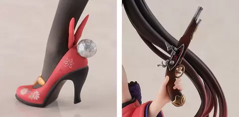 F:NEX「時崎狂三-和兔女郎-」1/7 比例模型,尺寸約高 27 公分,精心設計了結合和服風格的兔女郎裝扮!服裝以紅、黑兩色為基調,飄逸的長袖子與腰帶的細節設計都經過精心雕琢,並在圖樣上融入時鐘和齒輪的圖案,傳達作品世界觀。大膽地擠出豐滿的線條,修長美腿施以彷彿穿著絲襪的色澤;高跟鞋設計出像兔子般的兔尾造型,左手握著的短槍「刻刻帝」也精心打造,營造厚重感。極具衝擊力的兔子耳朵、大山茶花髮飾、白色兔子尾巴等小細節都能感受到對細節的用心。