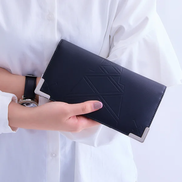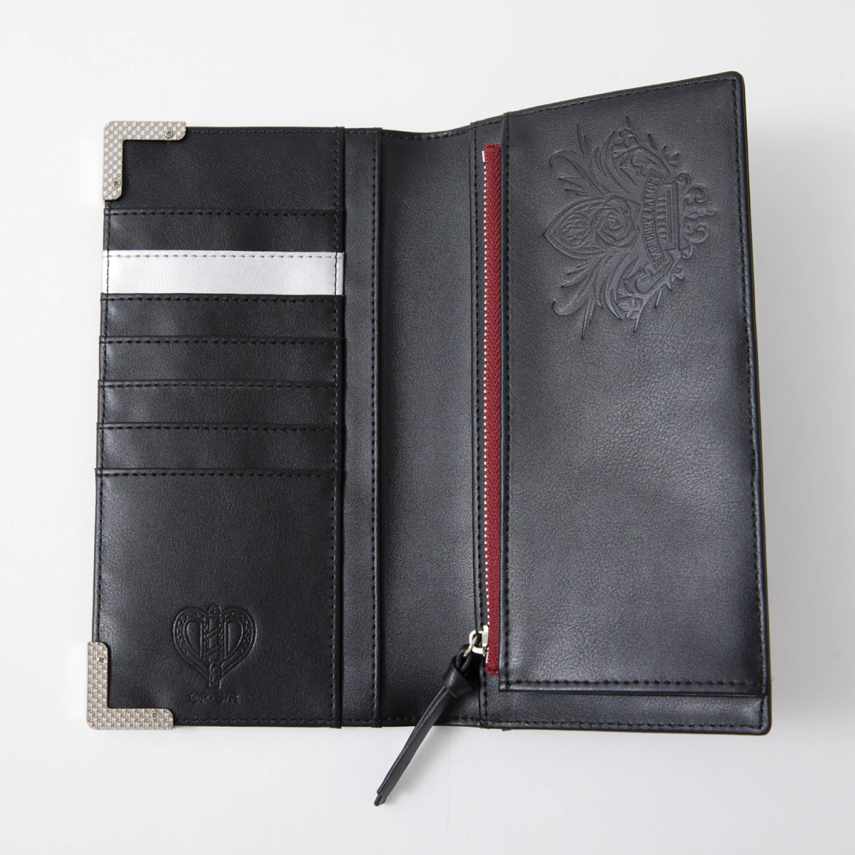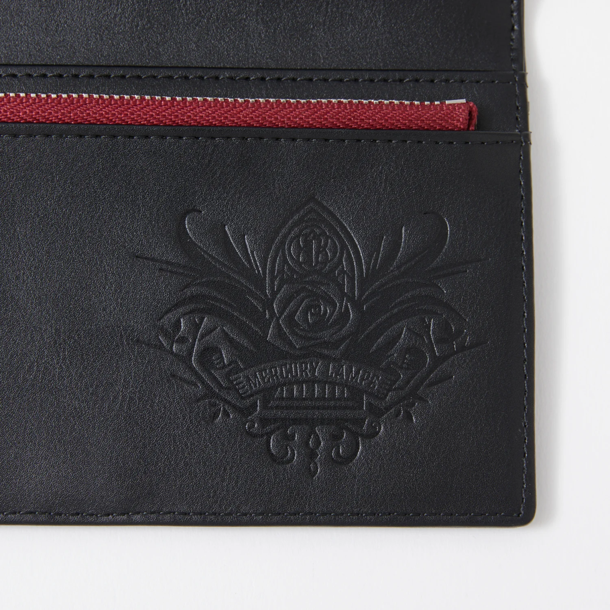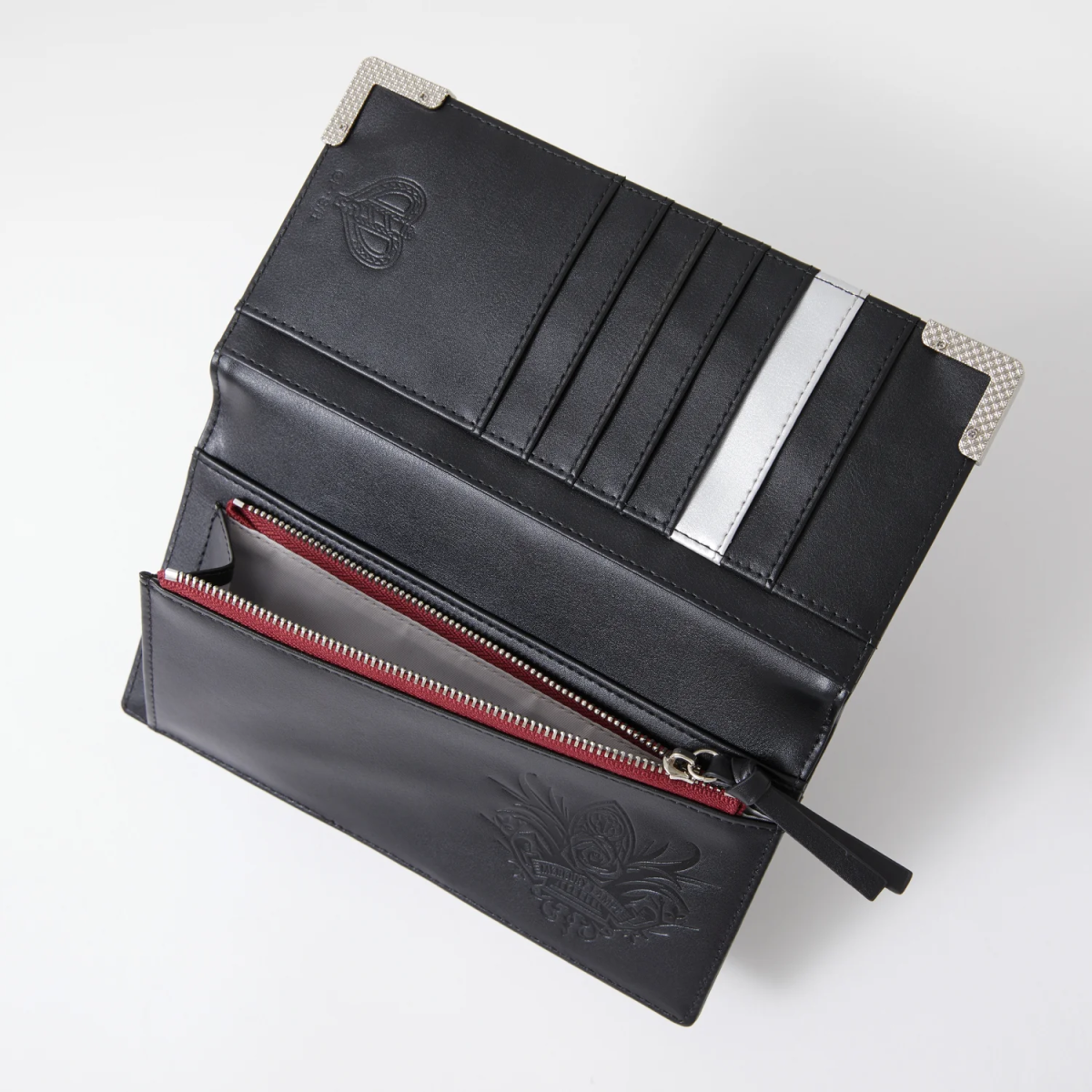 以漆黑色為基礎,皮夾外層有著水銀燈的緞帶以及逆十字鋼印,並配置銀色的邊框造型。開啟後內裡也不馬虎,除了大量卡片收納空間外,還有拉鍊零錢包配置,內裡配有「薔薇の薇(ゼンマイ)」以及原創的水銀燈的圖案。