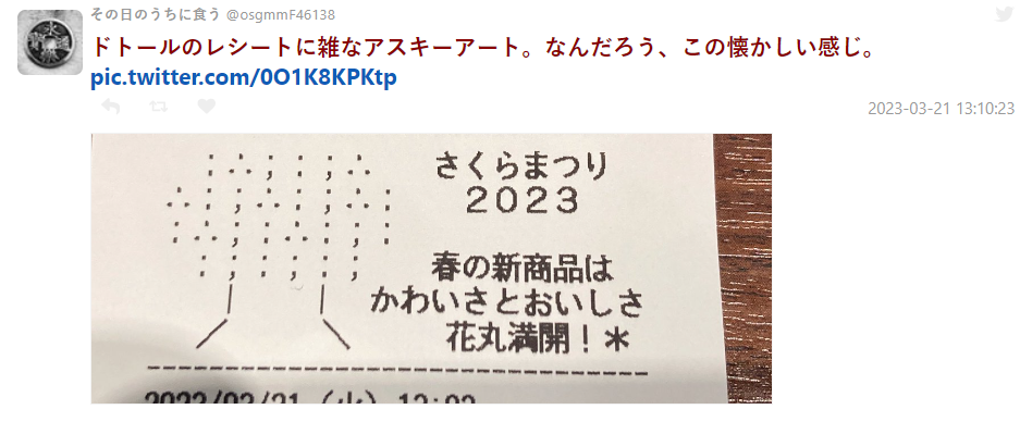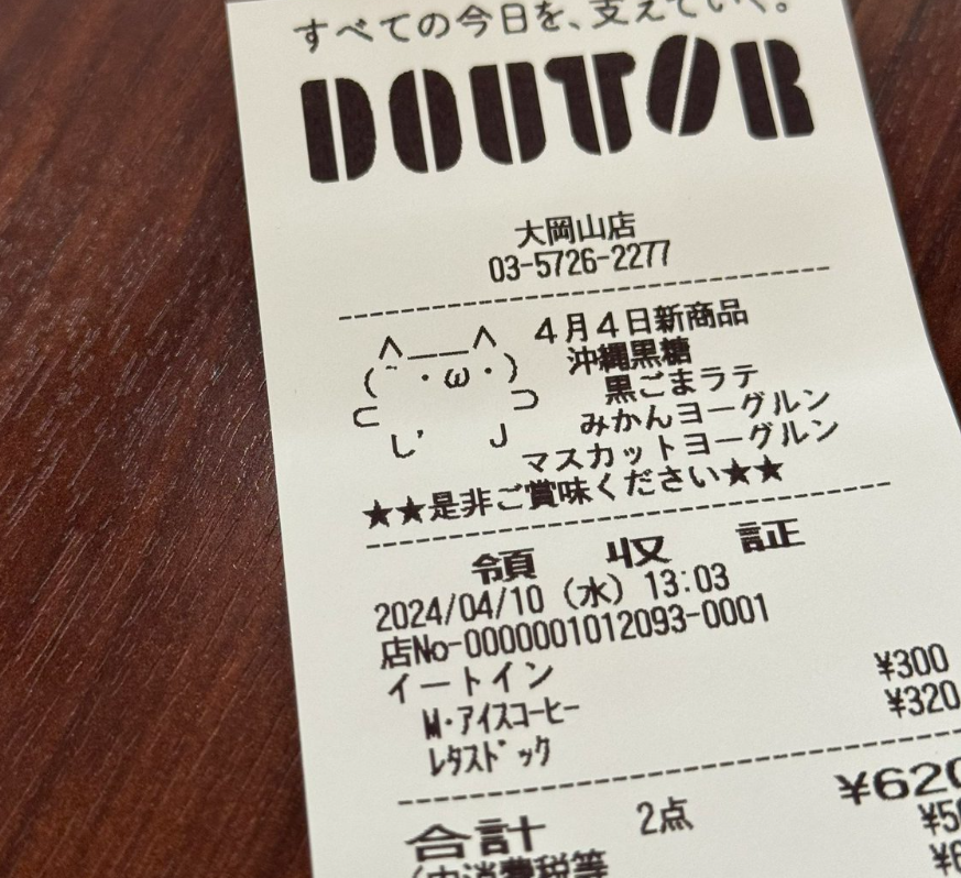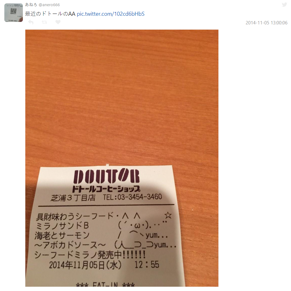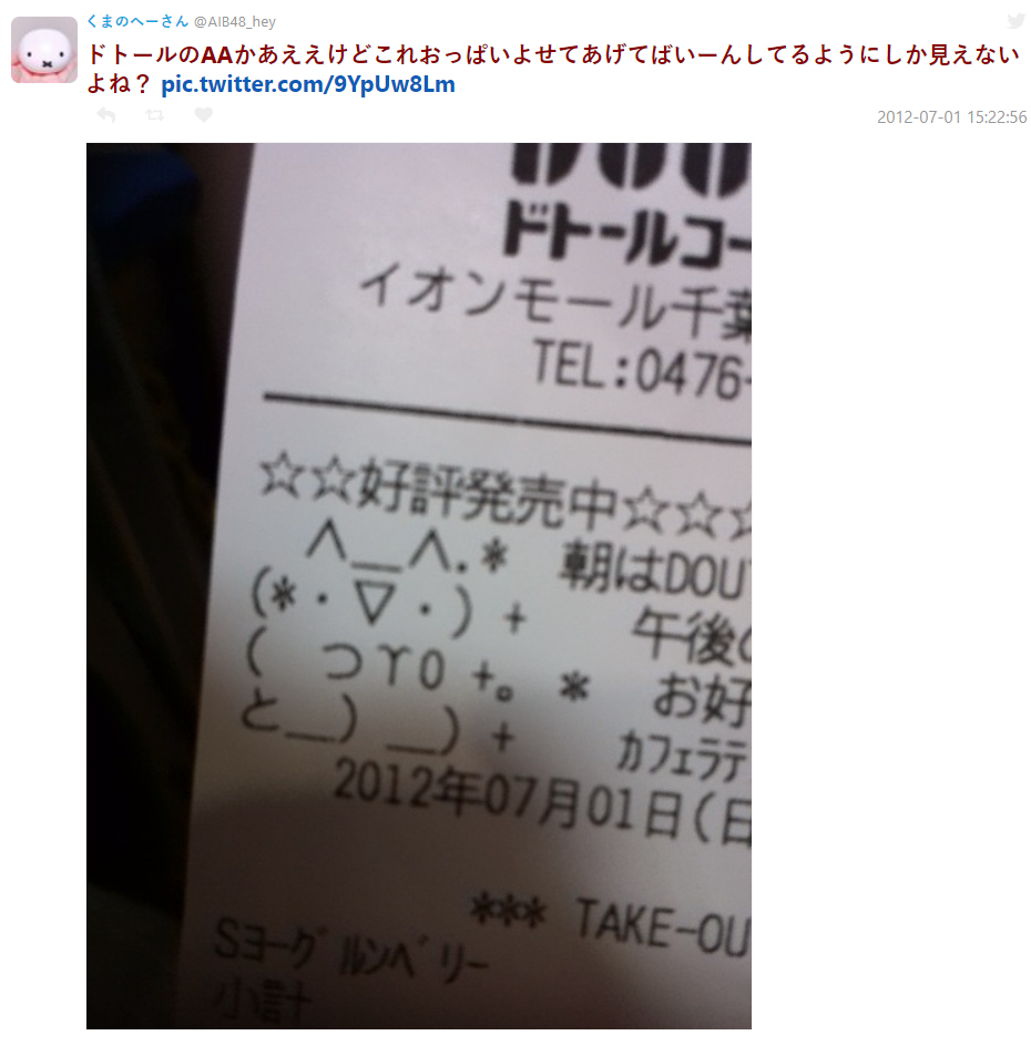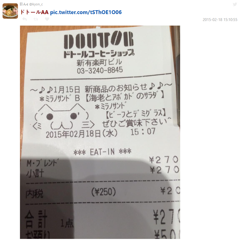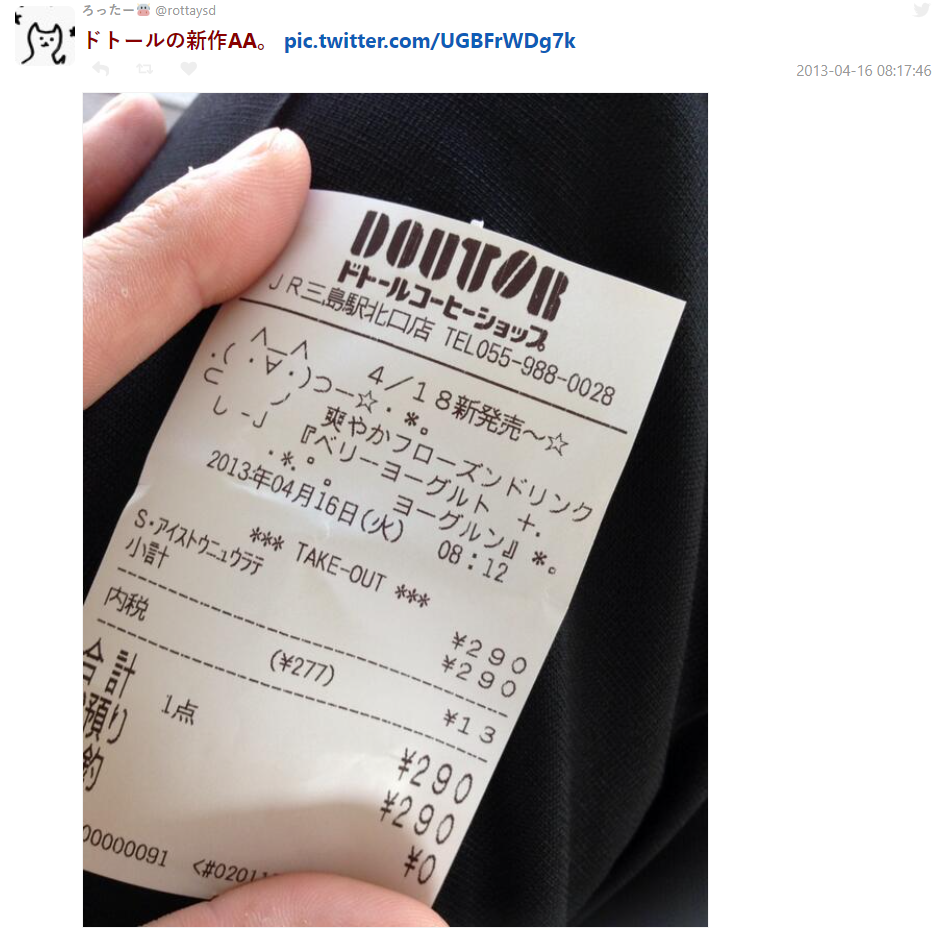不過網友發現其實這樣的應用,DOUTOR 已經行之有年,超過 12 年以上都在收據上附上 ASCII 插圖,或許比起這間普遍日本民眾還是常去星巴克,發現的人比較鮮少。