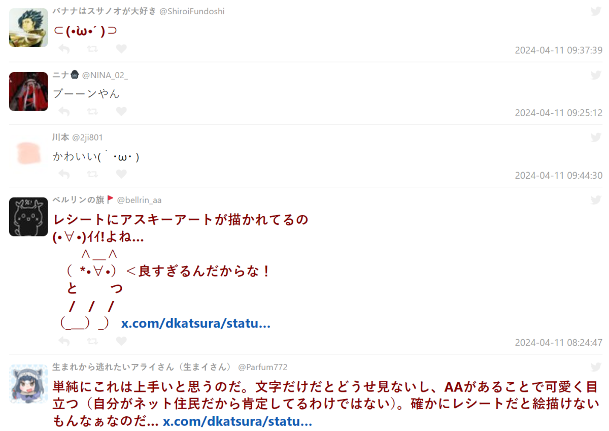 對於日本的網路使用者來說,這樣的圖案非常親切,畢竟平常在網路上都很常用,這讓許多網民會想要到咖啡店消費,由於每間店甚至每次都有不同的插圖,就想拿收據來看看會得到怎樣的圖案。