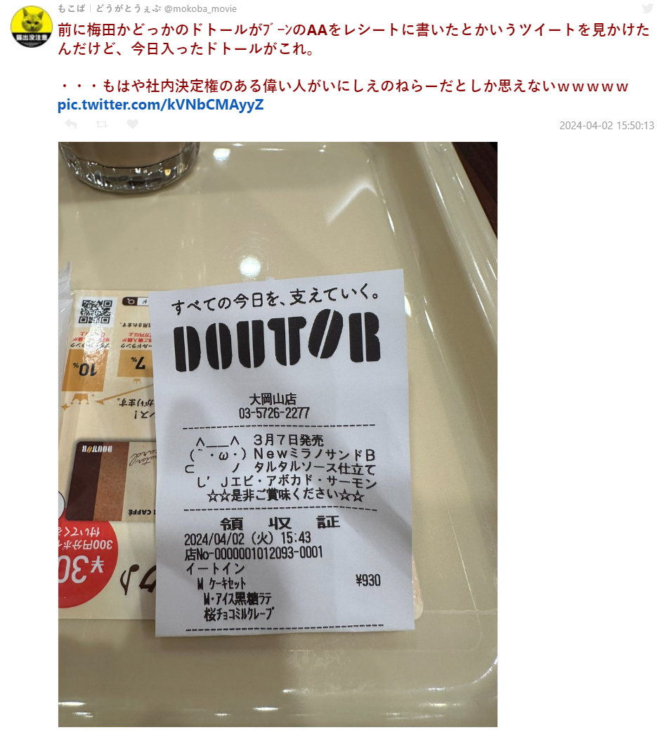 事實上對於一般人來說,這就像是常見的顏文字插圖,DOUTOR 的收據上就是放上這樣貓咪圖案,雖說並沒有特別的意涵,不過格外有種可愛的親切感,推主也開玩笑說這是星巴克不會見到的小巧思。