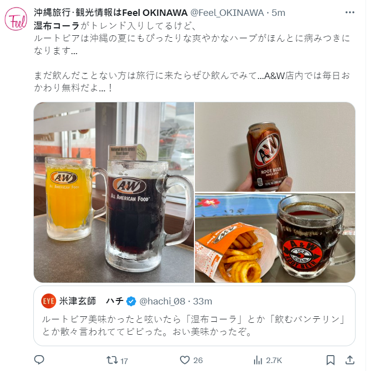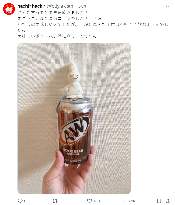 米津玄師的推文如下,表示曾聽過被稱作「貼布味可樂」 &「可以喝的貼布」的美國 A&W 麥根沙士,一直都很想嘗試,這次喝到之後真的很棒。