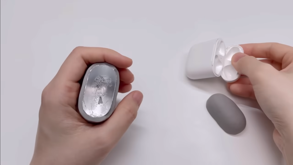 黏土製作上,用錫箔紙先把 AirPods 包住,再透過黏土包覆後先製作出雛形後取出 AirPods,再透過加熱讓它固定成形。