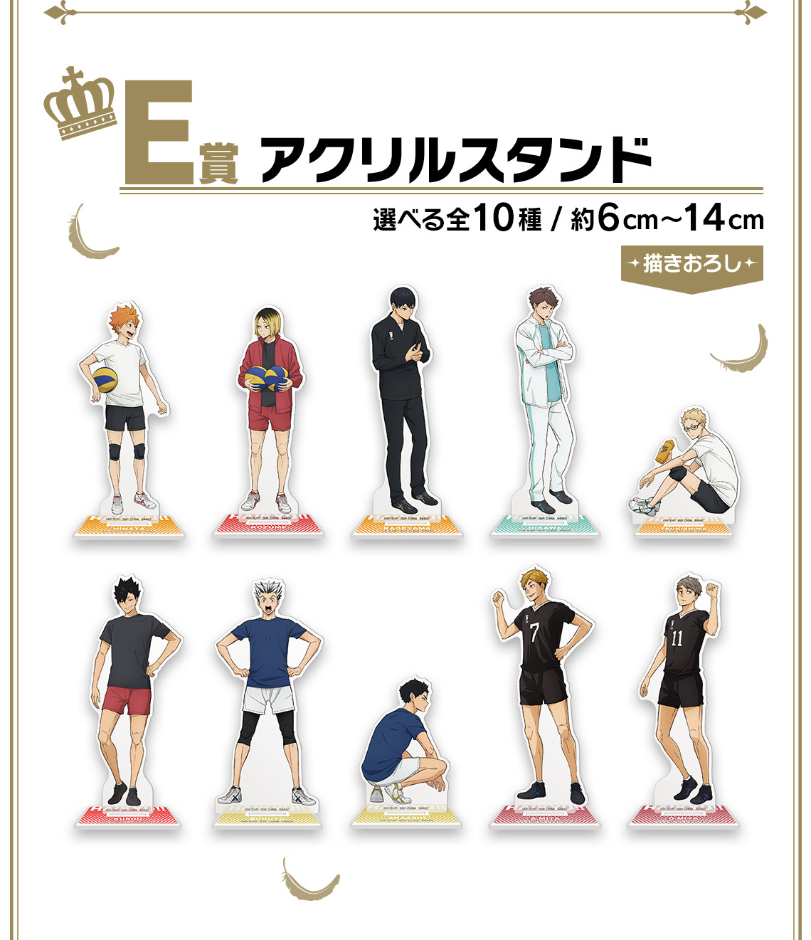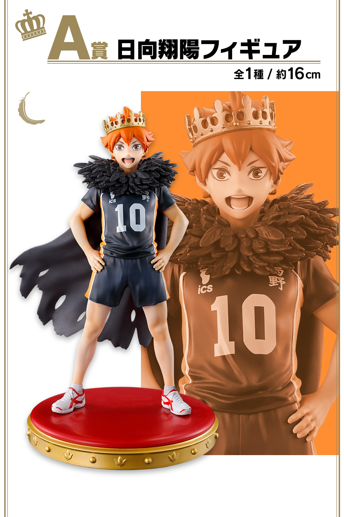 『一番賞 排球少年!!~10th anniversary!~』,以 10 周年紀念插畫的造型為主軸,共推出 A ~ H 賞+最後獎、雙重中獎機會等豐富的獎項!搶先公開戴上王冠的 A賞 「日向翔陽」、 B賞「影山飛雄」角色模型!!!日向超酷的烏鴉與毛披風相當迷人,影山華麗的造型也一定要帶回家!另外還有的壓克力立牌、布偶、毛巾和插畫板等精彩的獎品,用來慶祝這充滿紀念的時刻~