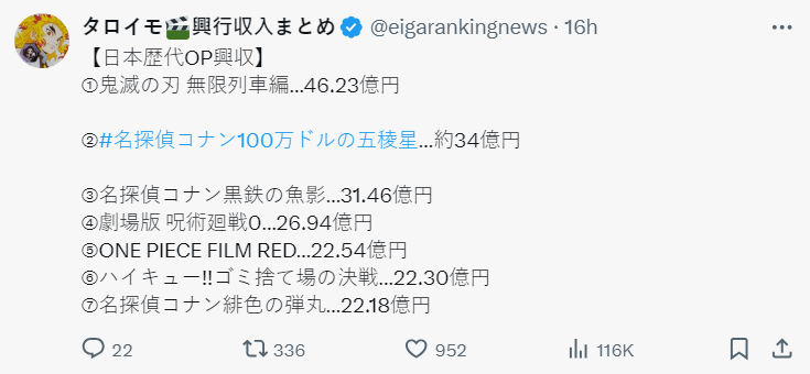這次的紀錄超過了去年大賣 138 億票房的《名偵探柯南:黑鐵的魚影》,僅落後現象級的《鬼滅之刃劇場版 無限列車篇》,根據首三日數據,周末票房兩天都超過 10 億日圓,足以見得柯南的魅力以及日本民眾已經視其為每年的例行公事,進場支持一波。