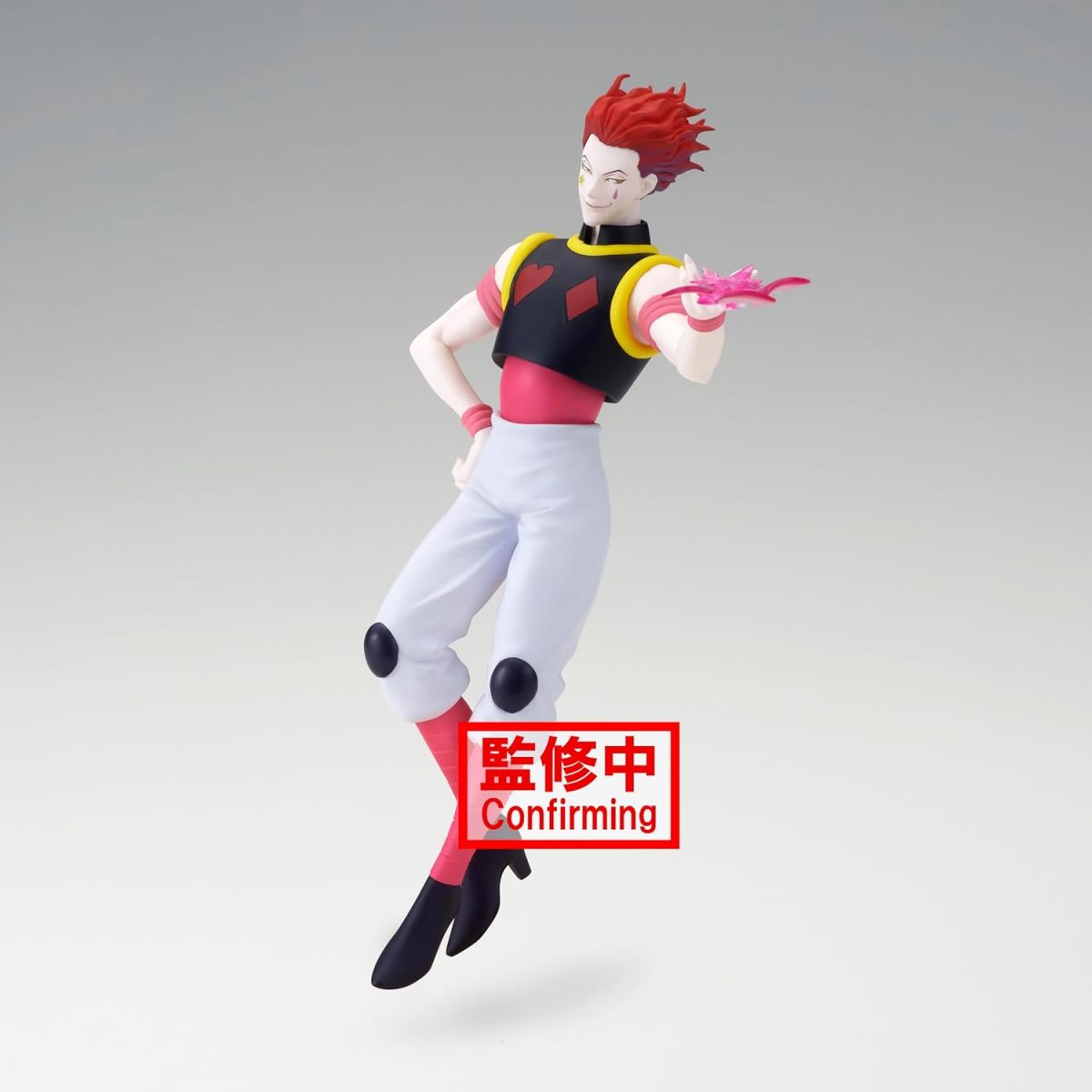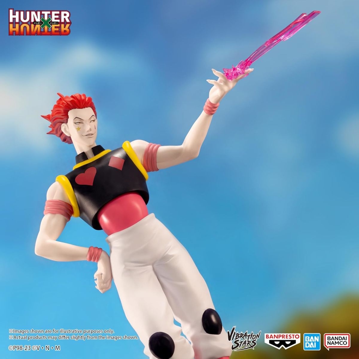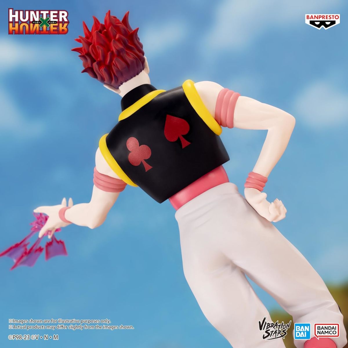 BANPRESTO「VIBRATION STARS-西索-」景品,尺寸全高約 18 公分,還原西索特徵的白皮膚與一頭紅髮,再現特色的服裝造型和極纖細小蠻腰,臉上的星星與水滴圖樣當然也不能少~利用粉紅色的透明特效件表現將撲克牌射出的威力!可以與同系列的「伊耳謎」一起擺飾。