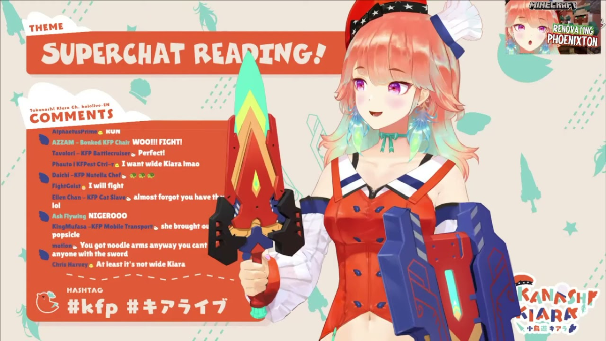 被粉絲稱作「火雞」&「店長」的小鳥遊琪亞拉,從 2020 年出道,人物造型上手持的劍和盾牌是戰鬥用的武器,平常直播鮮少拿出來。身為 hololive EN 一期生神話組,如今頻道也有 150 萬的訂閱數,雖來自奧地利卻有著流利的日文,也是 EN 目前唯一一位歐洲出身的成員。