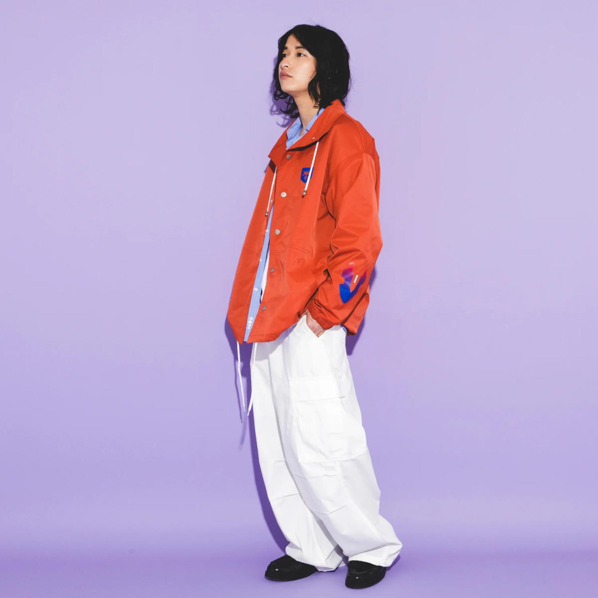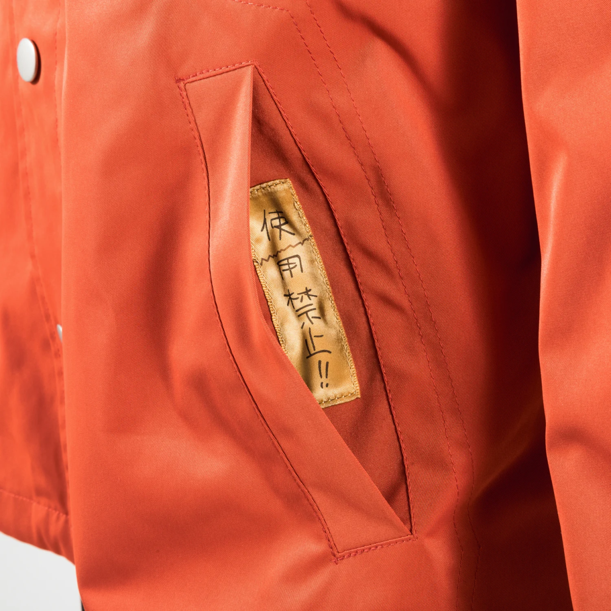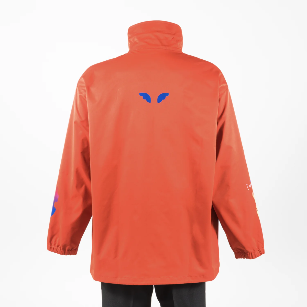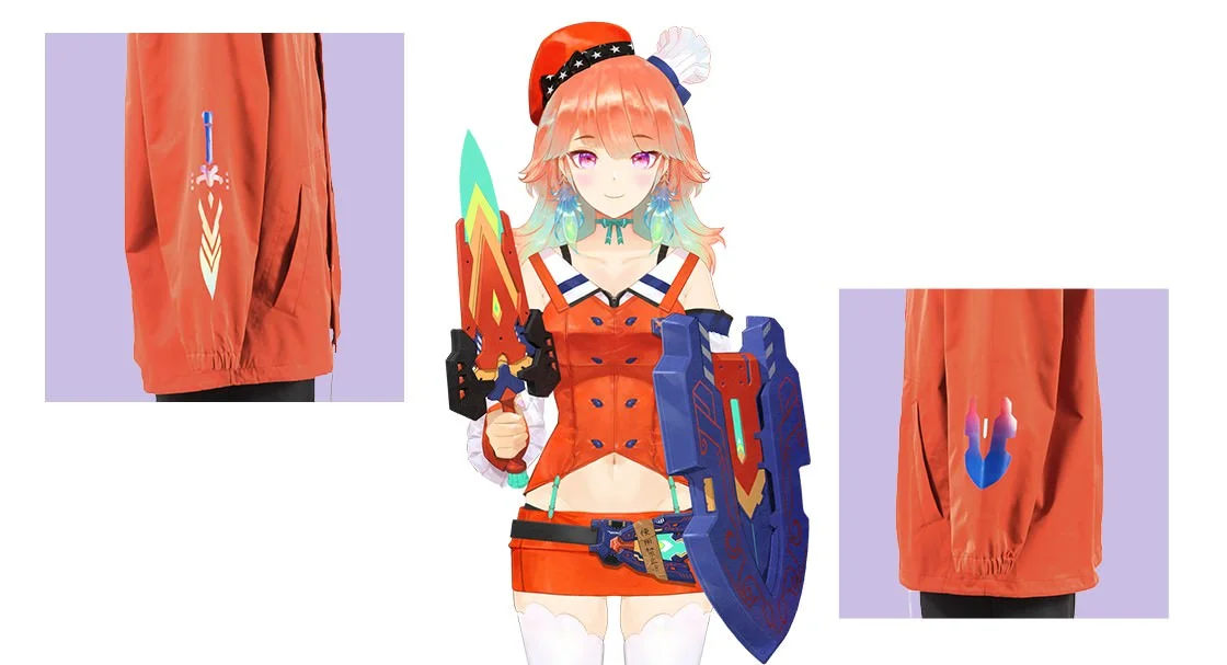 以小鳥遊琪亞拉的主色系橘色來打造,右手與左手臂有著劍與盾牌的設計,背後還有設計小翅膀的圖案,象徵「HOLOTORI」的識別圖章,左手口袋有著「使用禁止」的緞帶細節設計也還原人設的變身腰帶設計。整體都有著其代表色的元素,排釦搭配可立領的設計也讓穿著更多變化。