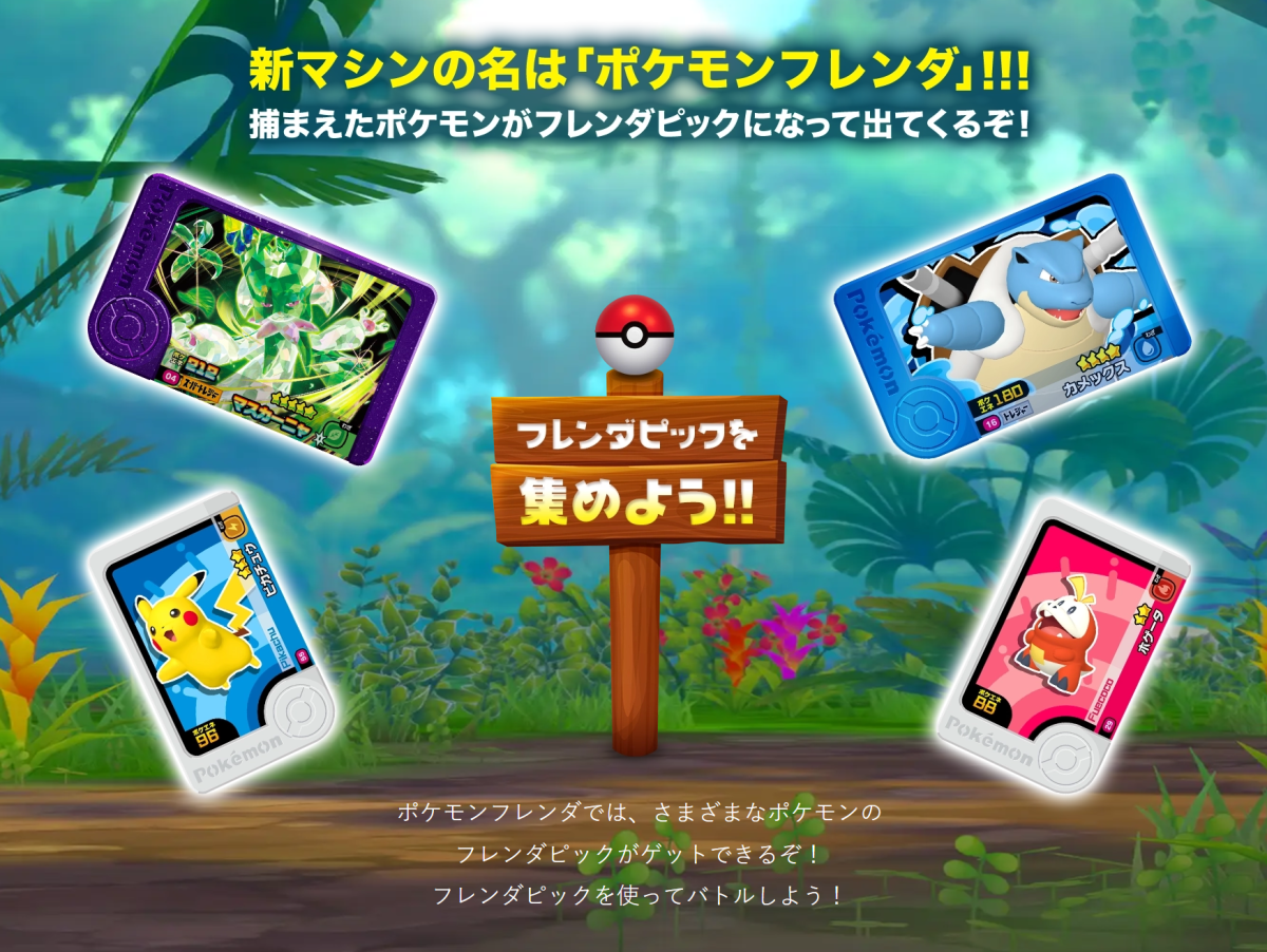 『Pokémon FRIENDA』是以先前的機台『Pokémon Mezastar』流行的兩邊同時遊戲的「雙機遊玩」功能,並採用觸控螢幕和按鈕進行直覺的操作,並享受讓您感覺更接近寶可夢的遊戲動作。每個機台都配備了兩個 50 吋的螢幕,玩起來震撼力更加充足。
