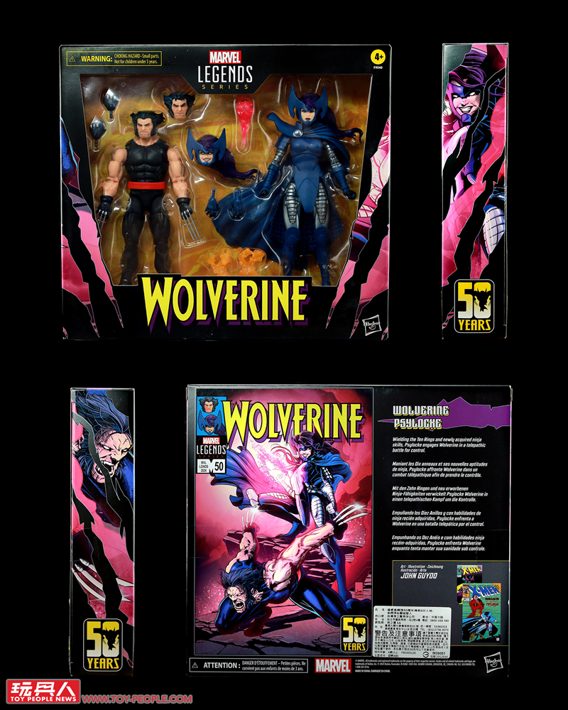 ▼「金鋼狼」與「靈蝶」(Psylocke)。盒背印有繪師約翰·蓋多(John Guydo)為其所畫的插圖,致敬1989年的《非凡X戰警》第256期的漫畫封面。